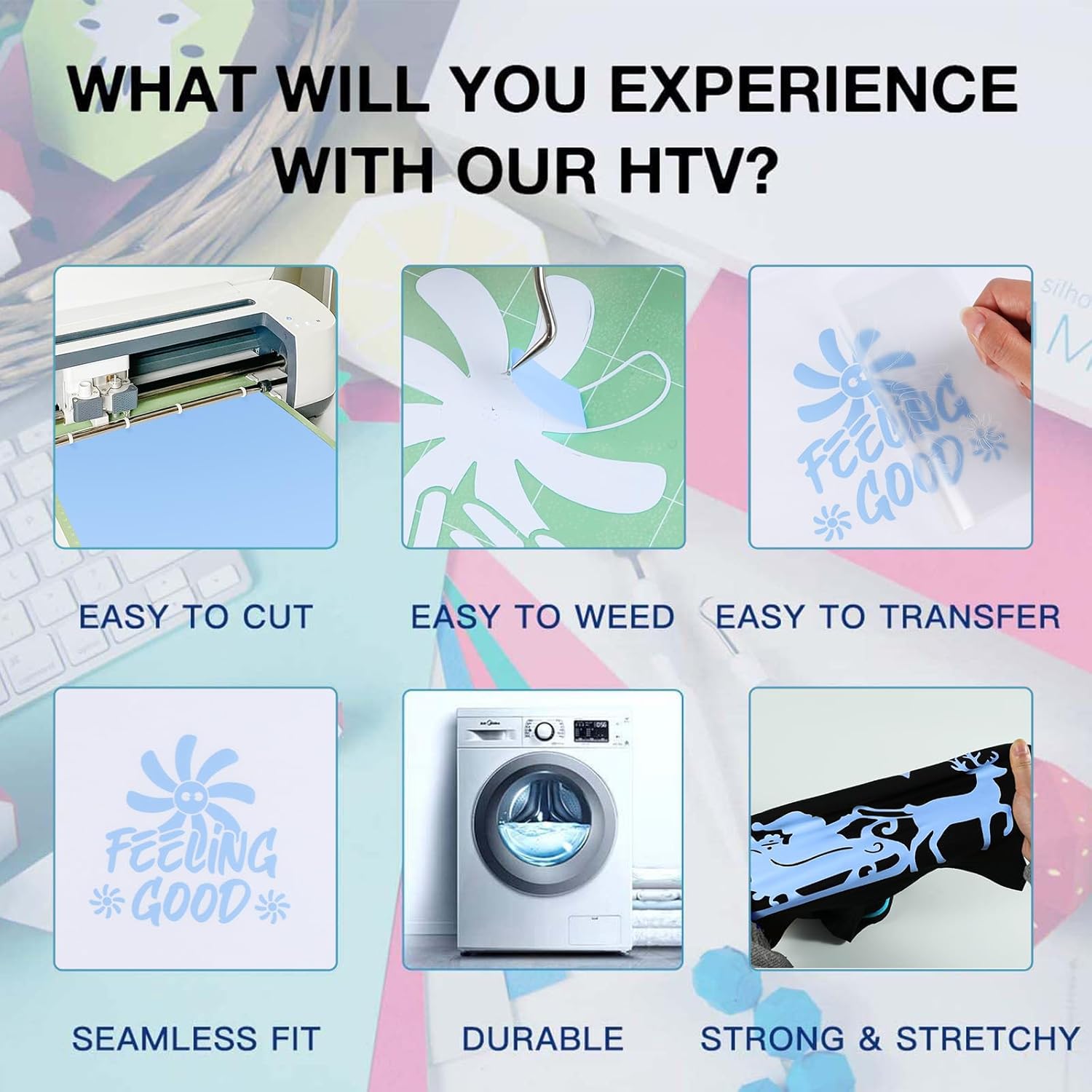- 【EASY TO CUT WEED TRANSFER】Our premium quality heat transfer vinyl will save time which you may waste on each image or letter, because you can cut and weed easily through the designs just right. The iron on vinyl is sensitive to temperature and pressure, which can be heat transferred to any t-shirt easily. Before cutting, make sure the blade is clean and sharp, so that your design can be cut well and weeding can be done better