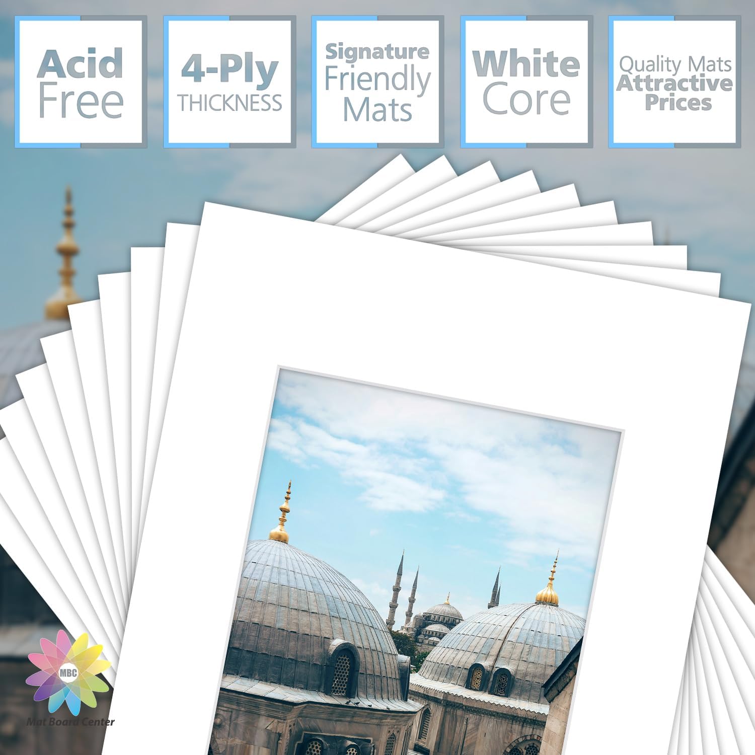- Bevel cut, acid free, 4-ply thickness, white core mats