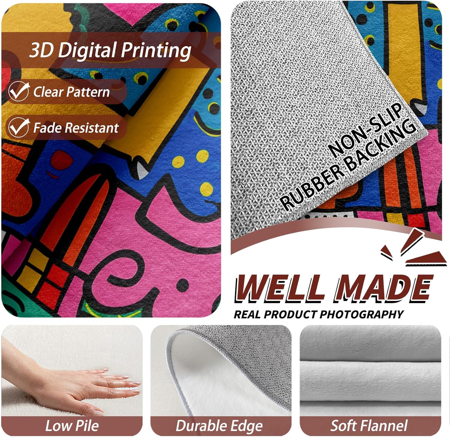 - ⭐【NON SLIP BOTTOM】 Worried about the danger caused by the carpet slipping during use? Don't worry! The bottom of our carpet is designed with a professional non-slip material TPR rubber backing to ensure that the carpet always stays firmly on the floor ,allowing you and your family to enjoy life with peace of mind