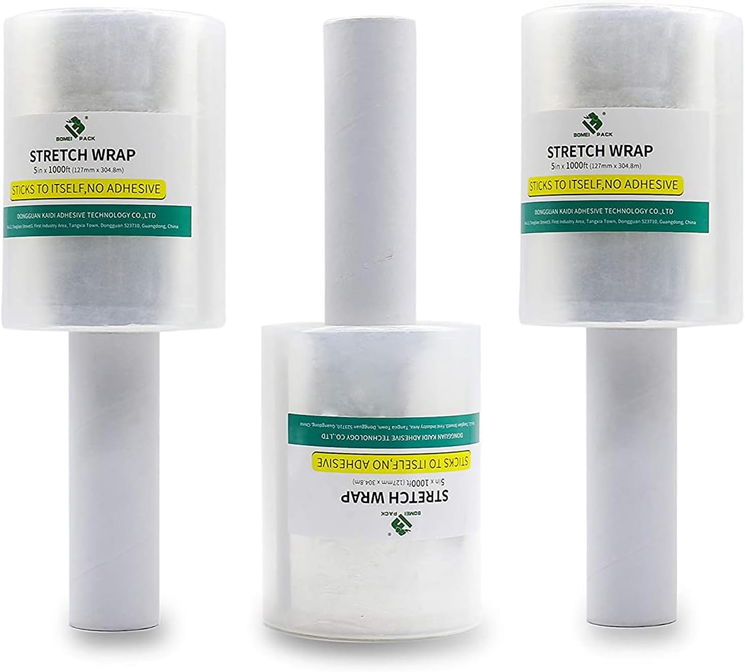 BOMEI PACK Industrial Mini Clear Stretch Wrap with Handle 5" 1000ft 80 Gauge for Pallet Wrap, Durable Self-Adhering Plastic Wrap for Packing, Moving, Heavy Duty (3)