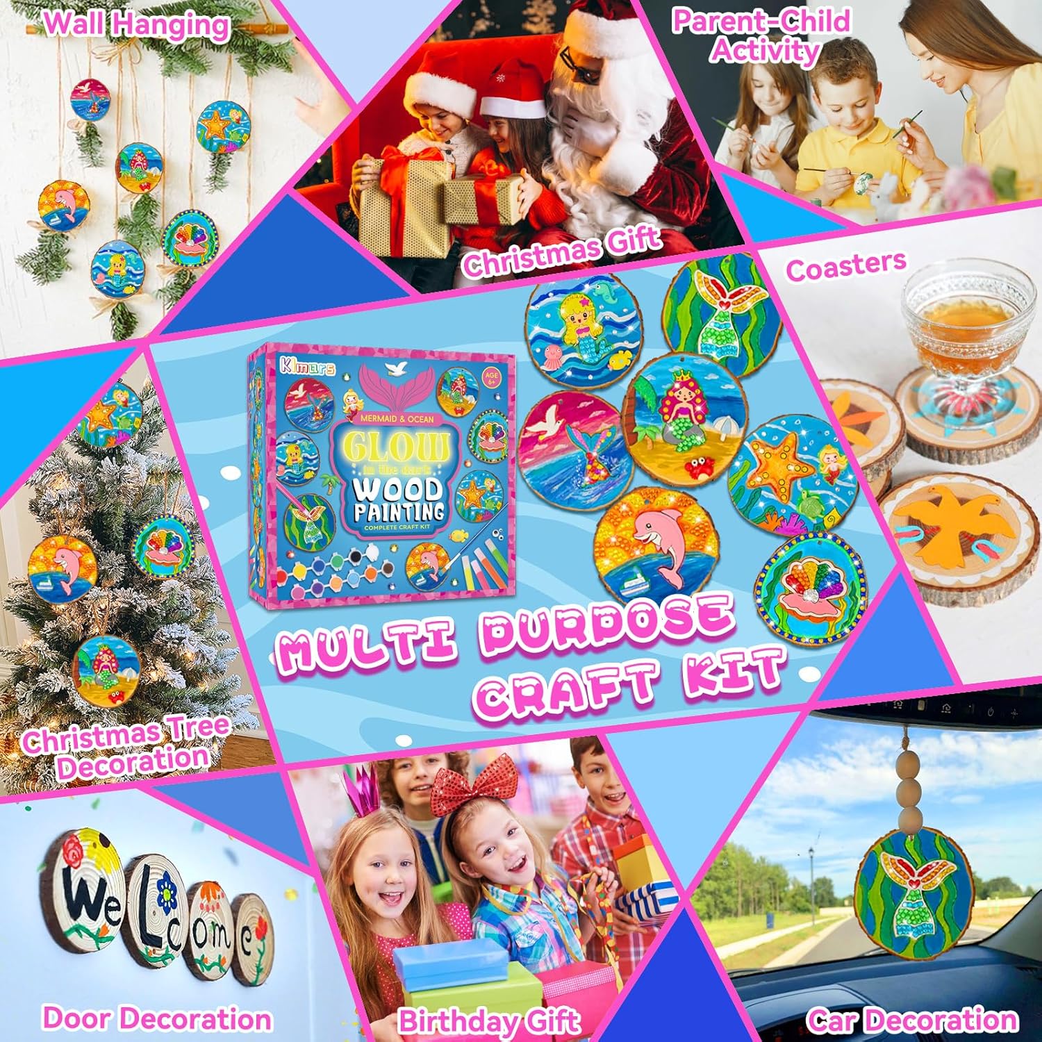 klmars Mermaid Themed Wooden Painting Kit-Glow in The Dark-Arts & Crafts Gifts for Kids Girls Ages 6-12-Wood Slice Craft Activities Kits -Mermaid Art Toys for Kids Christmas Gifts
