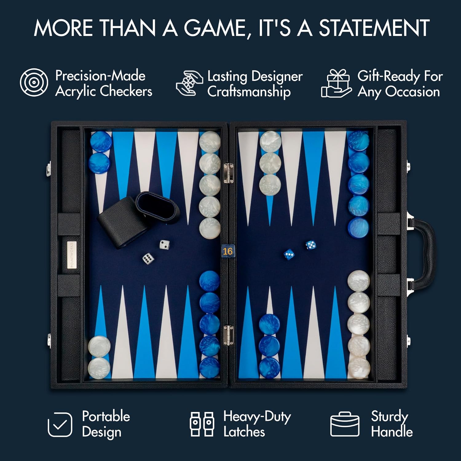19 Inch Premium Backgammon Sets for Adults Leather Black - Blue. Premium 1.6 Inch Checkers & Dice Set, Travel Backgammon Set, Large, Backgammon Board Game, Backgammon Game Set