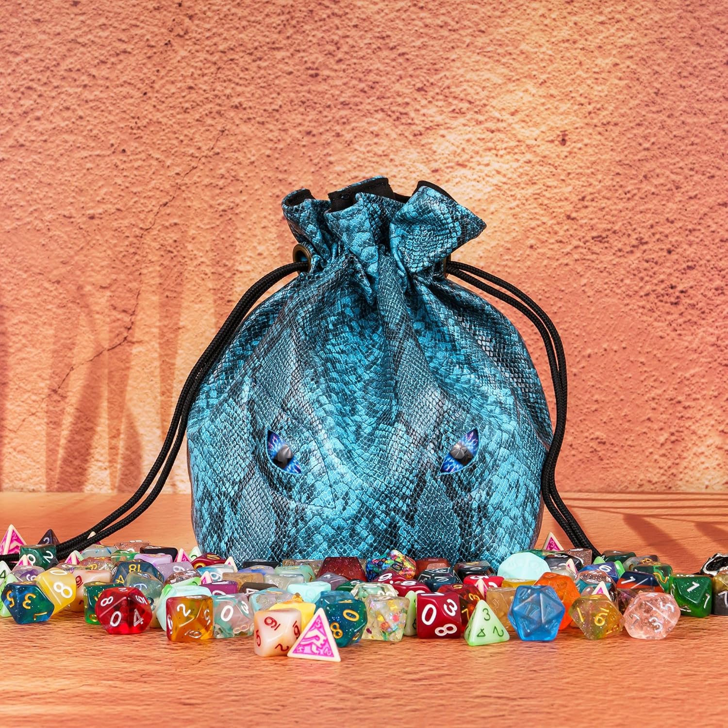 - Unique Appearance: The dnd dice bag has attractive dragon scales skin and fantasy dragon eyes, and has a robust drawstring and skull metal spring clip that ensures the bag closes tightly.