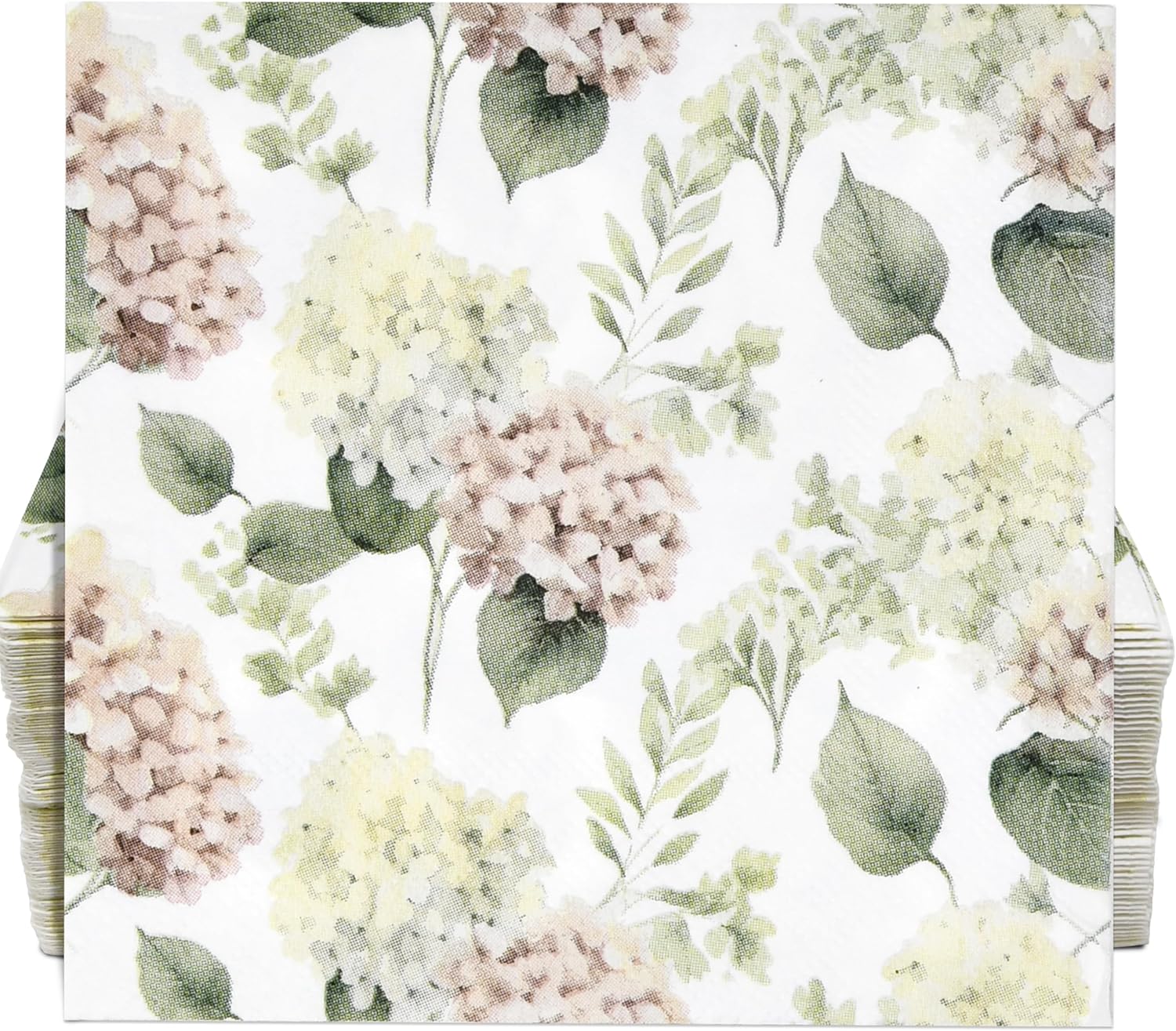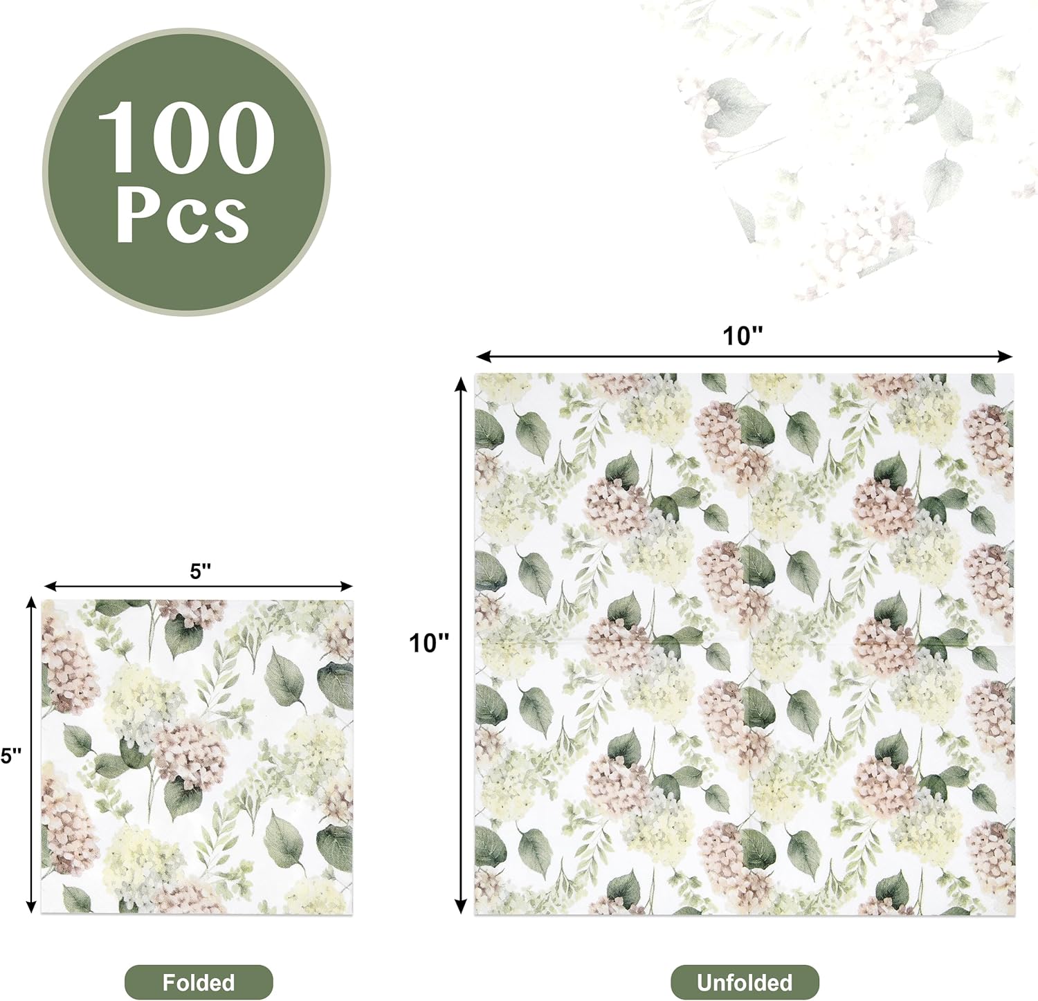 100 Pcs Hydrangea Scatter Floral Cocktail Beverage Napkins Hydrangeas Flowers Disposable Paper Dessert Napkin for Spring Summer Birthday Party Supplies