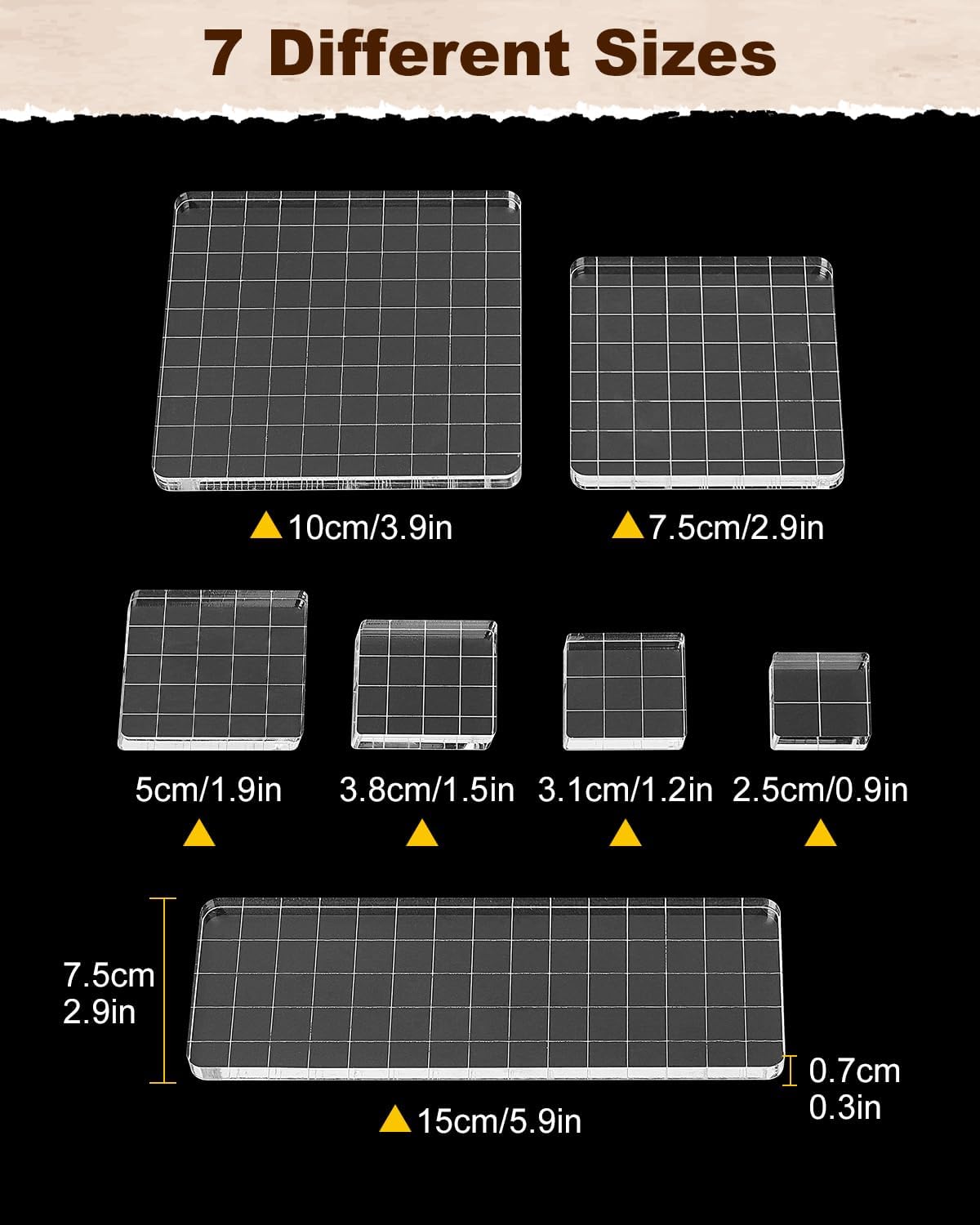 - 7 Versatile Sizes for All Stamping Needs:This set includes 7 different acrylic blocks for stamping: 15 x 5 cm, 10 x 10 cm, 7.5 x 7.5 cm, 5 x 5 cm, 3.8 x 3.8 cm, 3.1 x 3.1 cm, and 2.5 x 2.5 cm Perfect for large or small scrapbooking, ideal for stamps for crafting, essential in scrapbooking & stamping supplies, a must-have in your card making supplies, and perfectly suited for rubber stamps for crafting