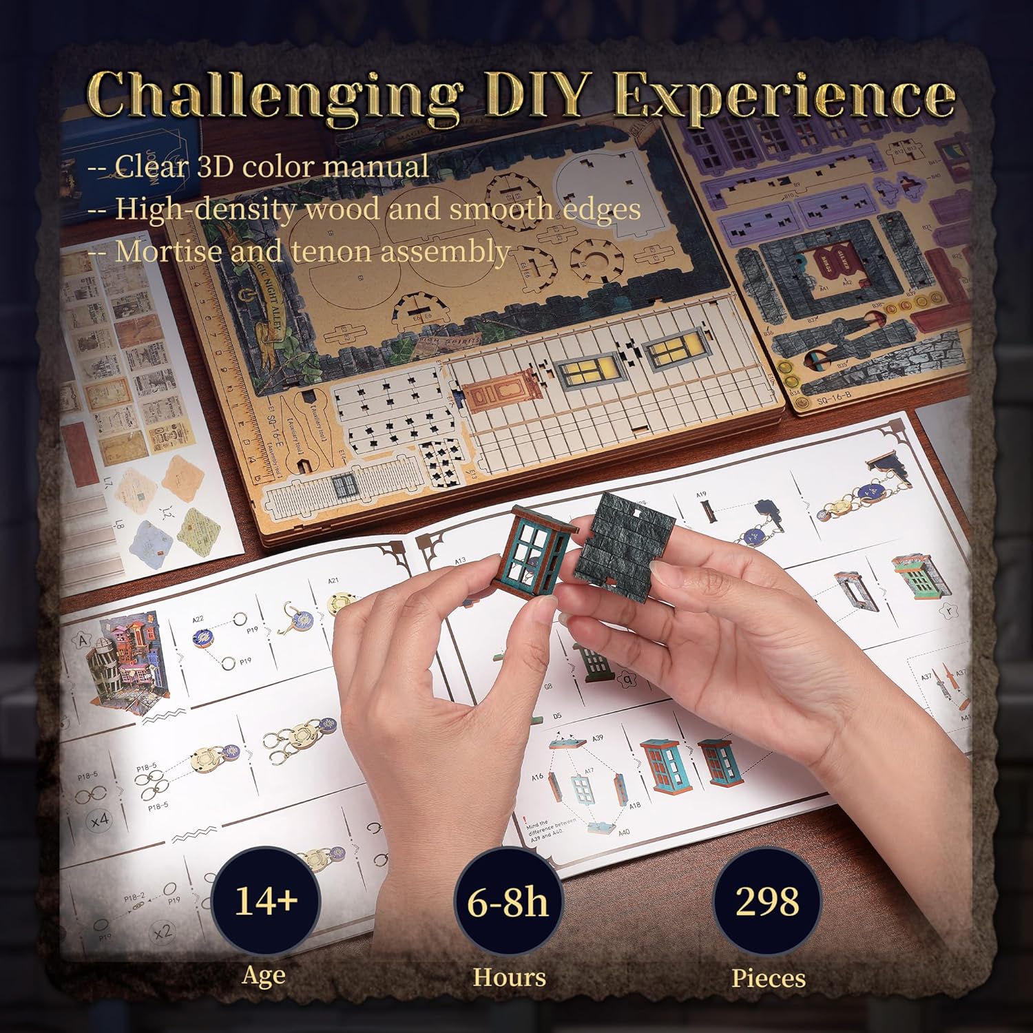 - 【Detailed Instructions and Easy Assembly】Crafted from 3mm plywood with 298 pre-cut pieces, this book nook kit provides 6-8 hours of focused and enjoyable DIY experience. The step-by-step, colorful assembly instructions ensure a detailed and clear building process.