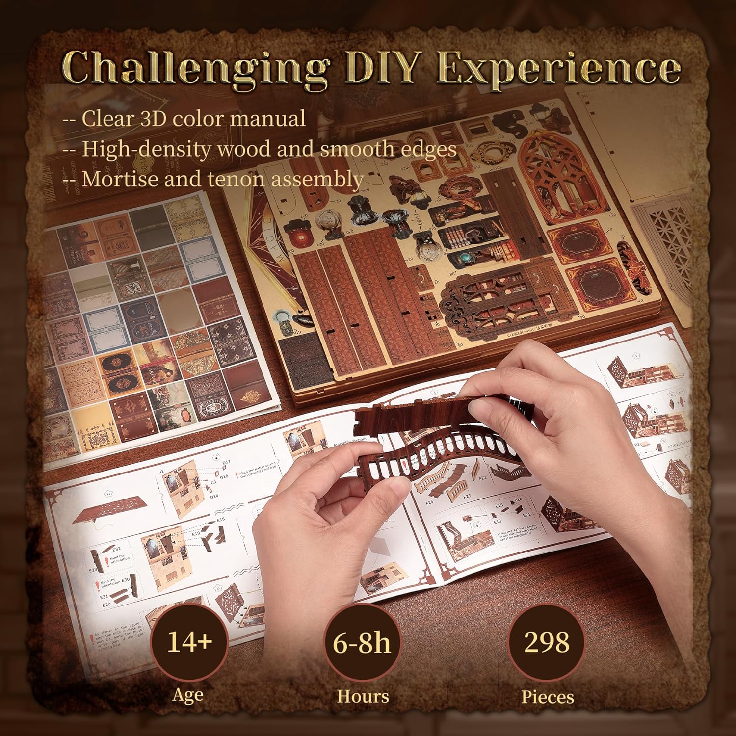 - 【Detailed Instructions and Easy Assembly】Crafted from 3mm plywood with 298 pre-cut pieces, this book nook kit provides 6-8 hours of focused and enjoyable DIY experience. The step-by-step, colorful assembly instructions ensure a detailed and clear building process.