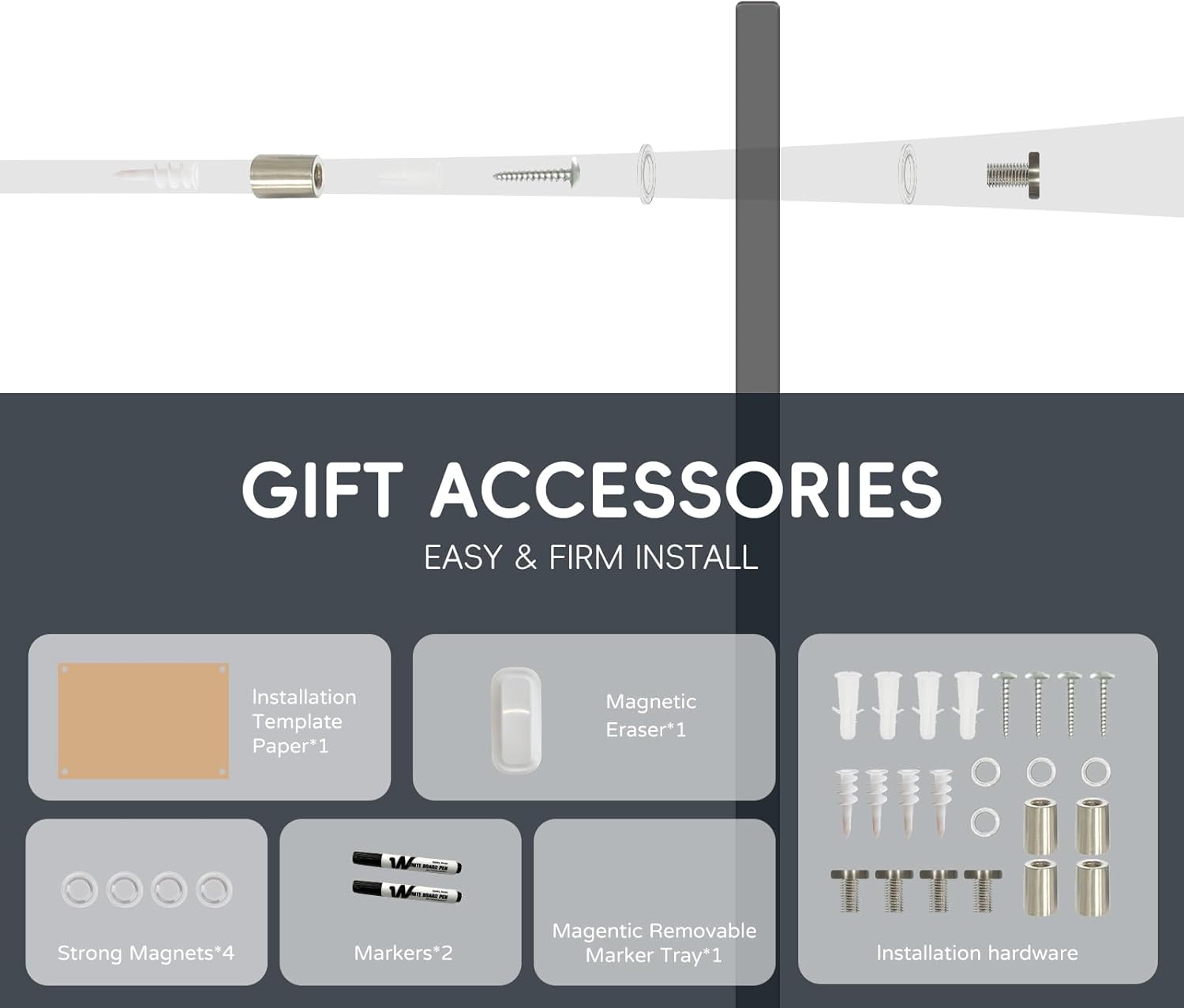 - Effortless Installation: Installing your glass blackboard is a breeze with our comprehensive mounting kit and step-by-step instructions. The pass-through mounting system allows you to secure the board vertically or horizontally, providing flexibility to fit your specific space and needs.