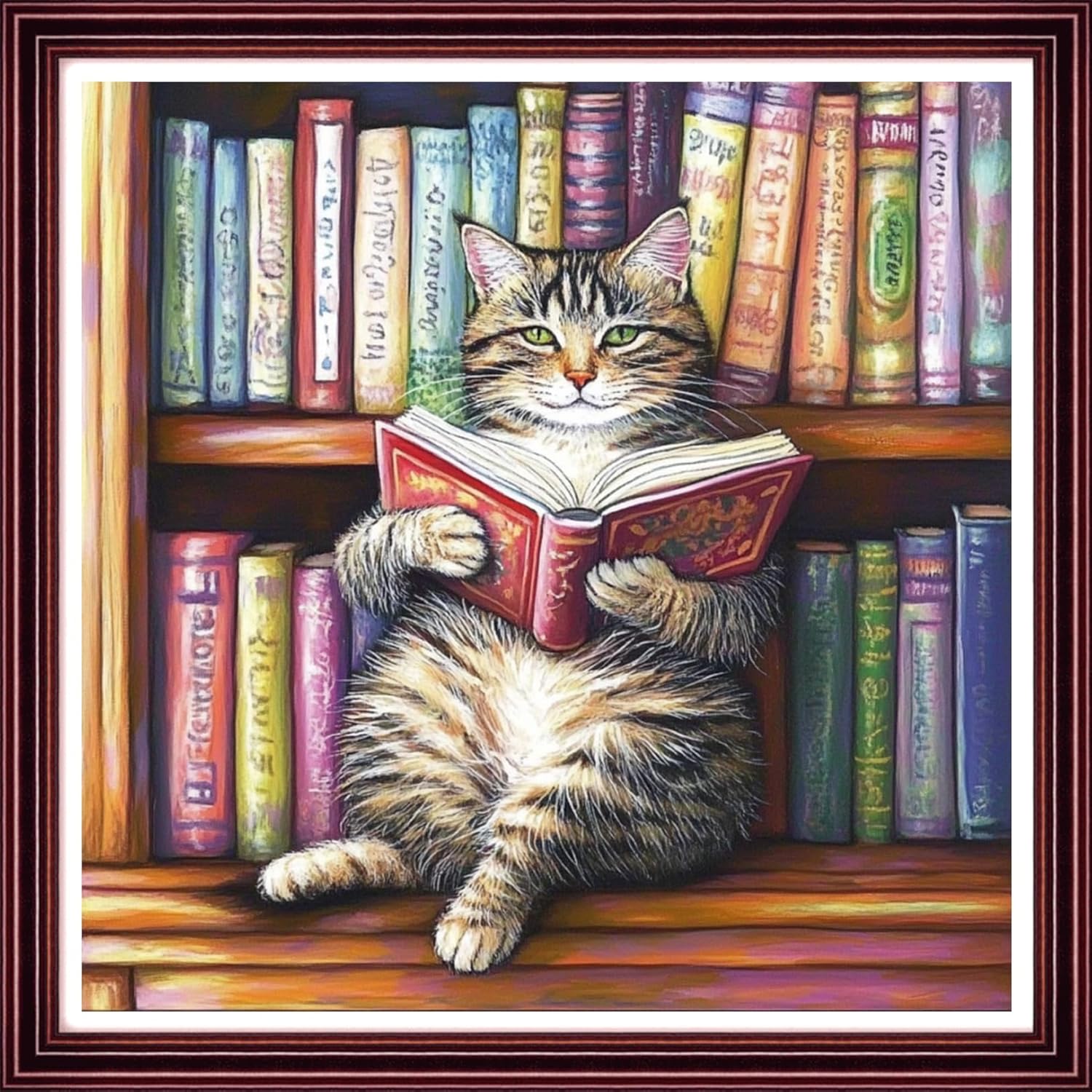 Redxing Stamped Cross Stitch Kits Full Range of Embroidery Starter Kits- Needlepoint Counted Cross Stitch Kits for Beginner Adults 11CT Printed Embroidery Kit-Reading on cat Bookshelf 18x18 inch