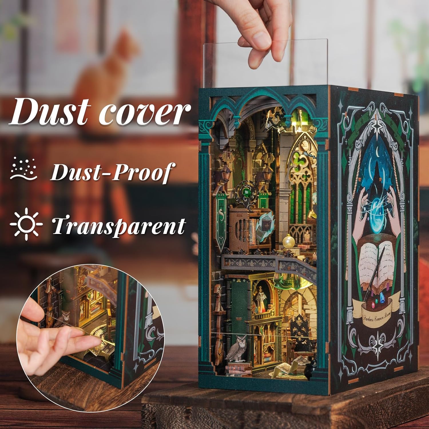 - 【Book Nook Kit with Dust Cover and LED Lights】The miniature house kit includes 239 accessories, with dust cover and touched sensor led lights