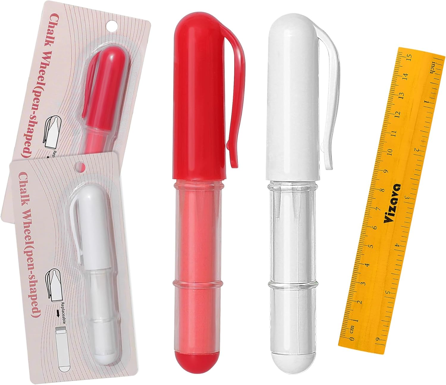 - ✅ Precision Marking: Vizava fabric chalk marker pens set includes 2 Colors fabric markers red and white sew chalks and one 15cm ruler .Chalk roller create lines clear visibility on dark or light fabrics and flawless markings on fabrics for sewing, quilting, and crafting.Perfect for drawing intricate patterns and precise lines.