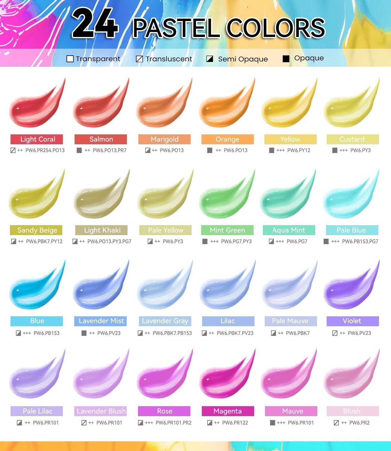 - Soft Pastel Colors Effects: This acrylic paint set features 24 macaron pastel colors, each with a 60ml volume. Made with high-grade pigments, these art paints offer intense color saturation and exceptional opacity. They provide smooth and consistent coverage, ensuring vivid, true-to-tone hues. The colors are blendable and mixable, allowing for a wide range of creative possibilities. Designed to resist fading, these paints maintain their brightness over time, making them perfect for eye-catching projects