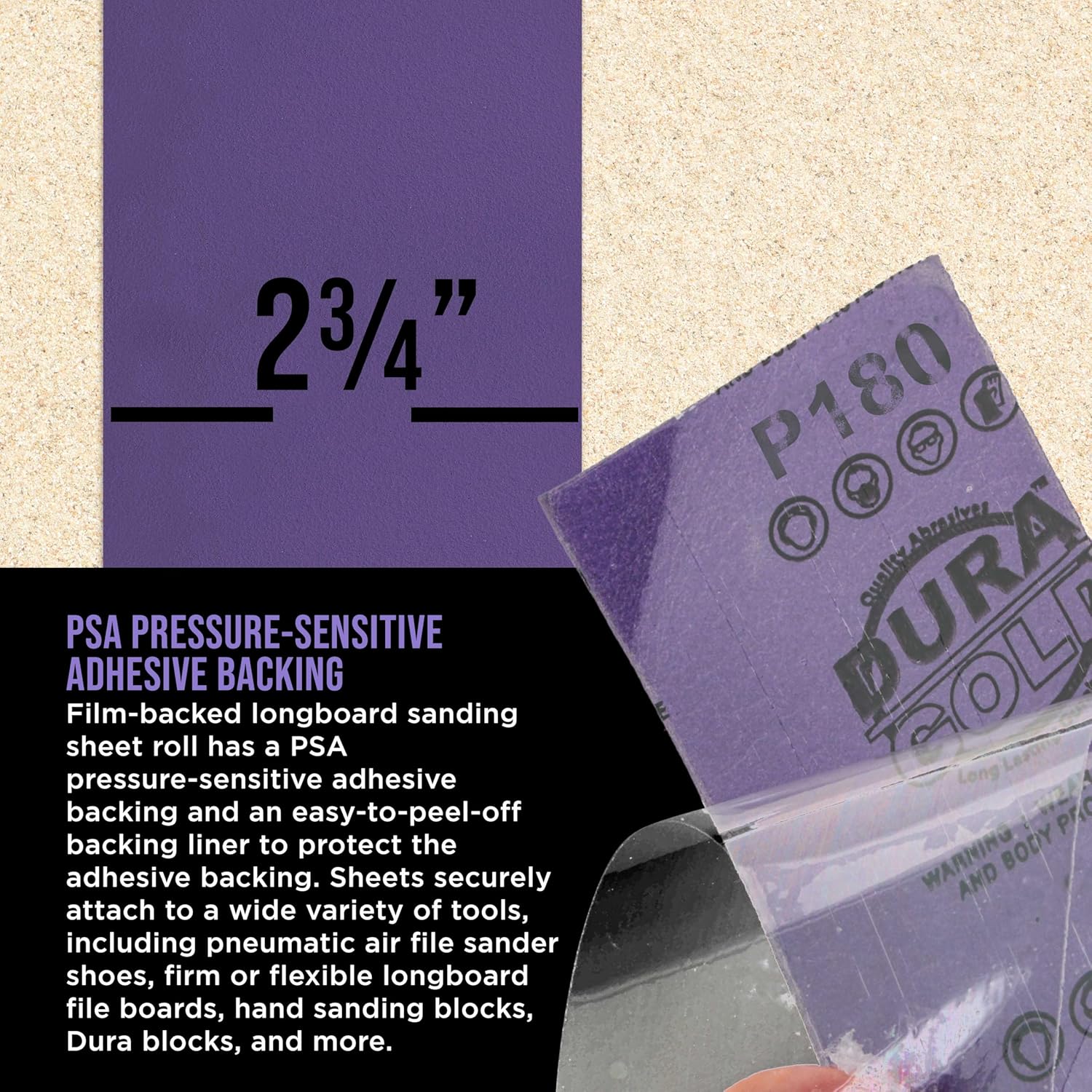- Dura-Gold Premium 180 Grit PSA Purple Film Ceramic Longboard Sandpaper Roll, 2-3/4" Wide Continuous 20 Yard Roll. This high-performance film-backed longboard sanding sheet roll has a PSA pressure-sensitive adhesive backing and an easy-to-peel-off backing liner to protect the adhesive backing. These PSA sanding sheets securely attach to a wide variety of tools, including pneumatic air file sander shoes, firm or flexible longboard file boards, hand sanding blocks, Dura blocks, and more.