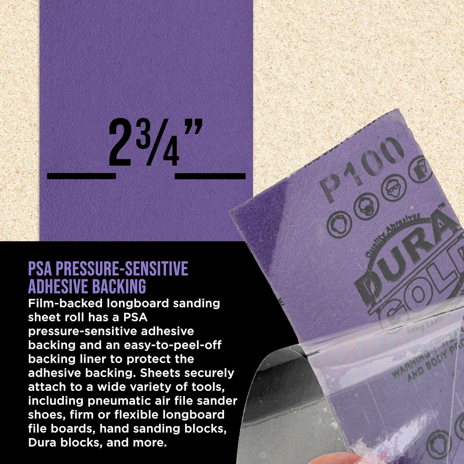 - Dura-Gold Premium 100 Grit PSA Purple Film Ceramic Longboard Sandpaper Roll, 2-3/4" Wide Continuous 20 Yard Roll. This high-performance film-backed longboard sanding sheet roll has a PSA pressure-sensitive adhesive backing and an easy-to-peel-off backing liner to protect the adhesive backing. These PSA sanding sheets securely attach to a wide variety of tools, including pneumatic air file sander shoes, firm or flexible longboard file boards, hand sanding blocks, Dura blocks, and more.