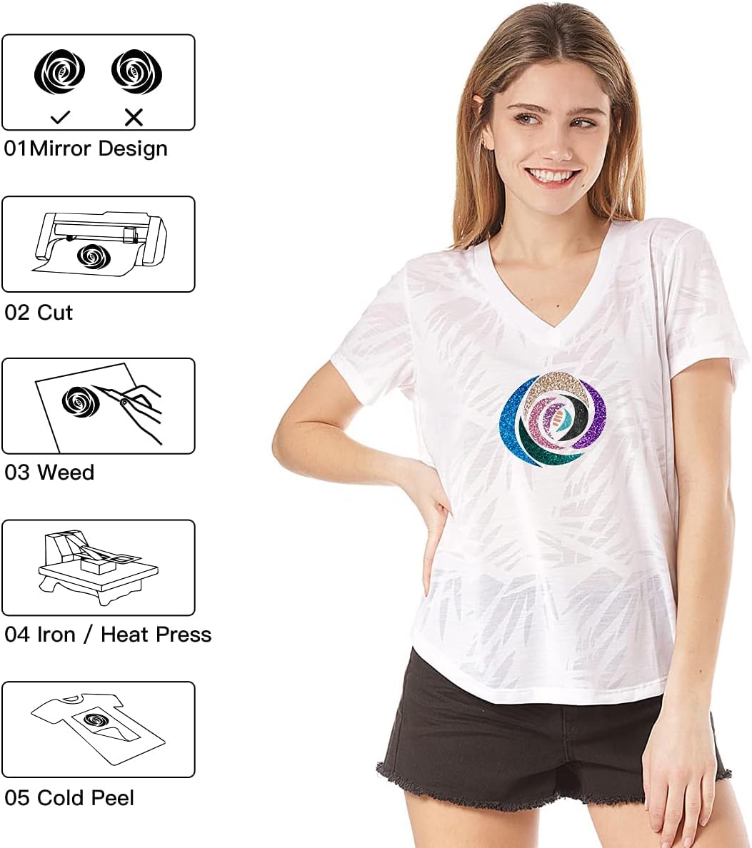- 【EASY TO CUT WEED TRANSFER】The glitter htv is thick with an excellent cutting application characteristics, any cutters’ blade can cut it through easily. The medium tack transfer film makes weeding like a dream, the glitter heat transfer vinyl is extremely sensitive to heat and pressure makes transfer quickly, which will save your time. The color of the featured image may vary depending on your screen