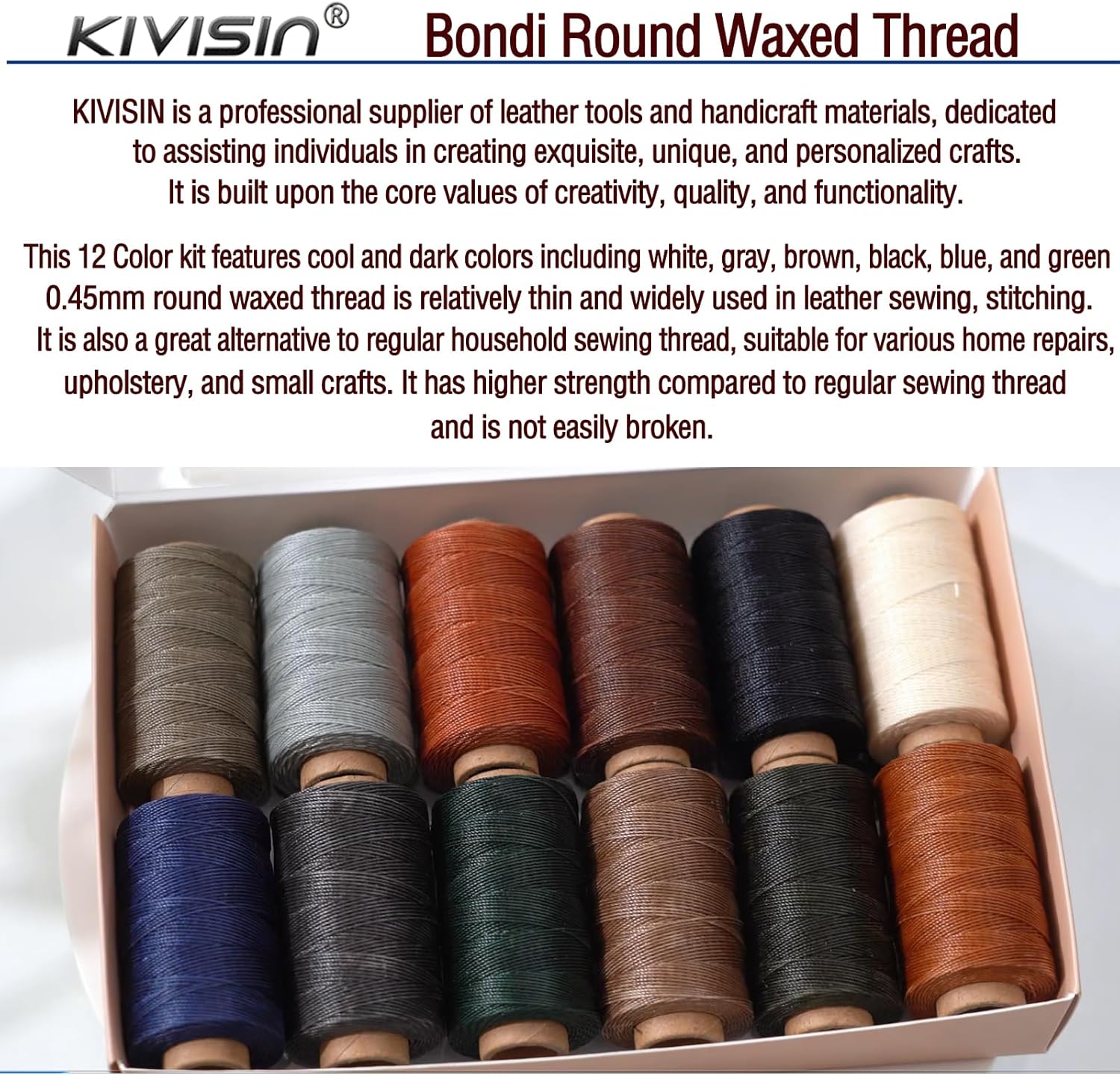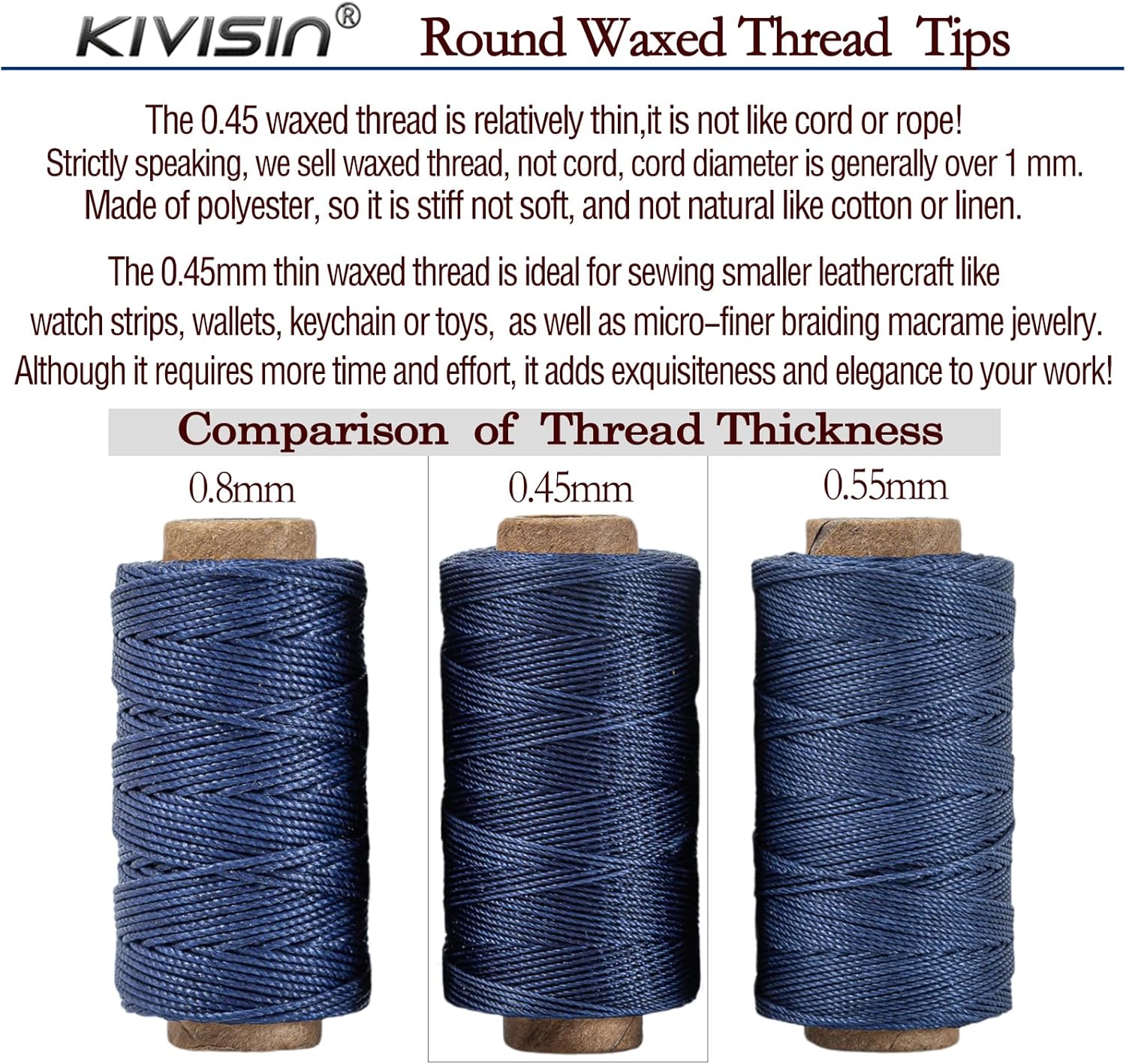- The 0.45mm thickness (tiny diameter 0.017 inches) Bondi round wax thread is thinner for small and delicate project such as wallets, handmade bags, watch strips, belts, toys, bookmarks, keychains, bracelets, micro macrame jelwery and upholstery. The 12 neutral colors ensure a close match to leather, canvas, or other fabrics that we usually see