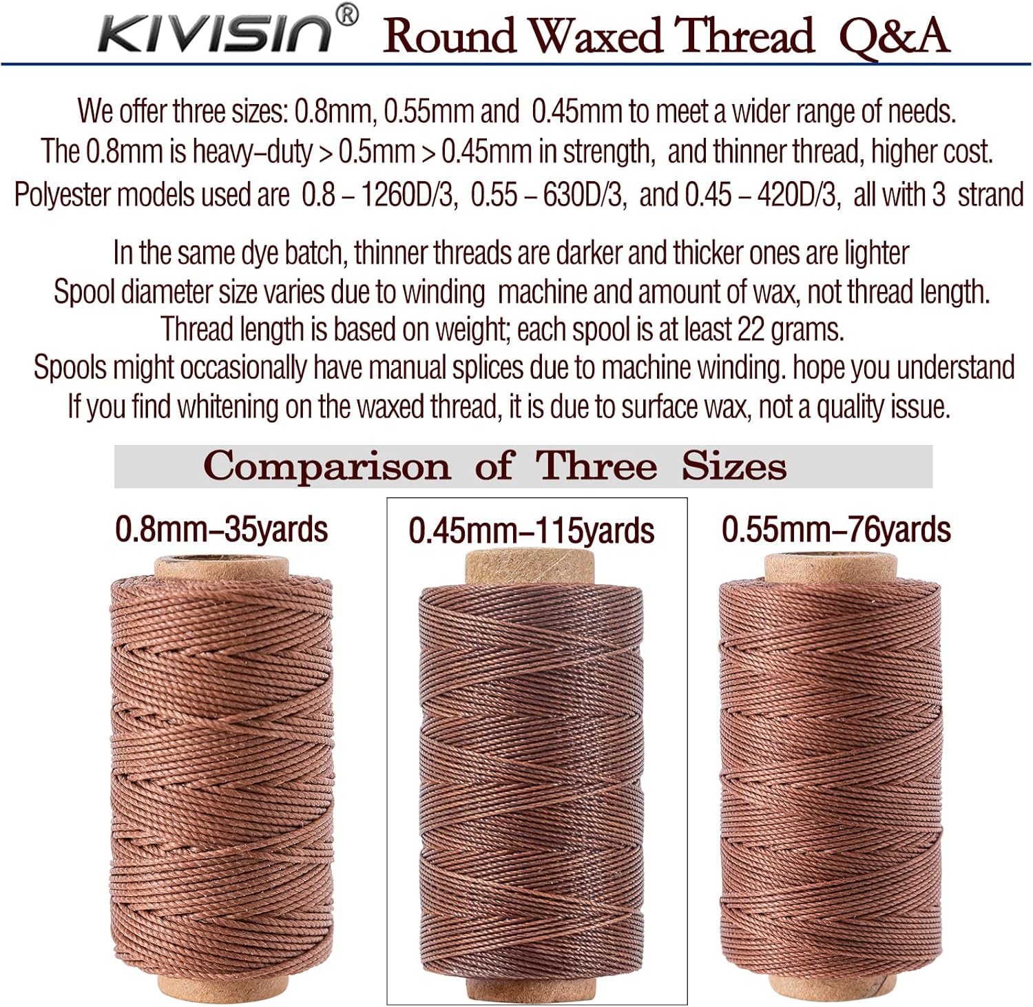 - KIVISN uses a superior blend of wax and a particular waxing process to ensure the wax fully penetrates the polyester string rather than just coating the surface. It is sturdy, waterproof, smooth, colorfast, non-fuzzy, knot-free and easy to shape, but it is inelastic and slightly sticky