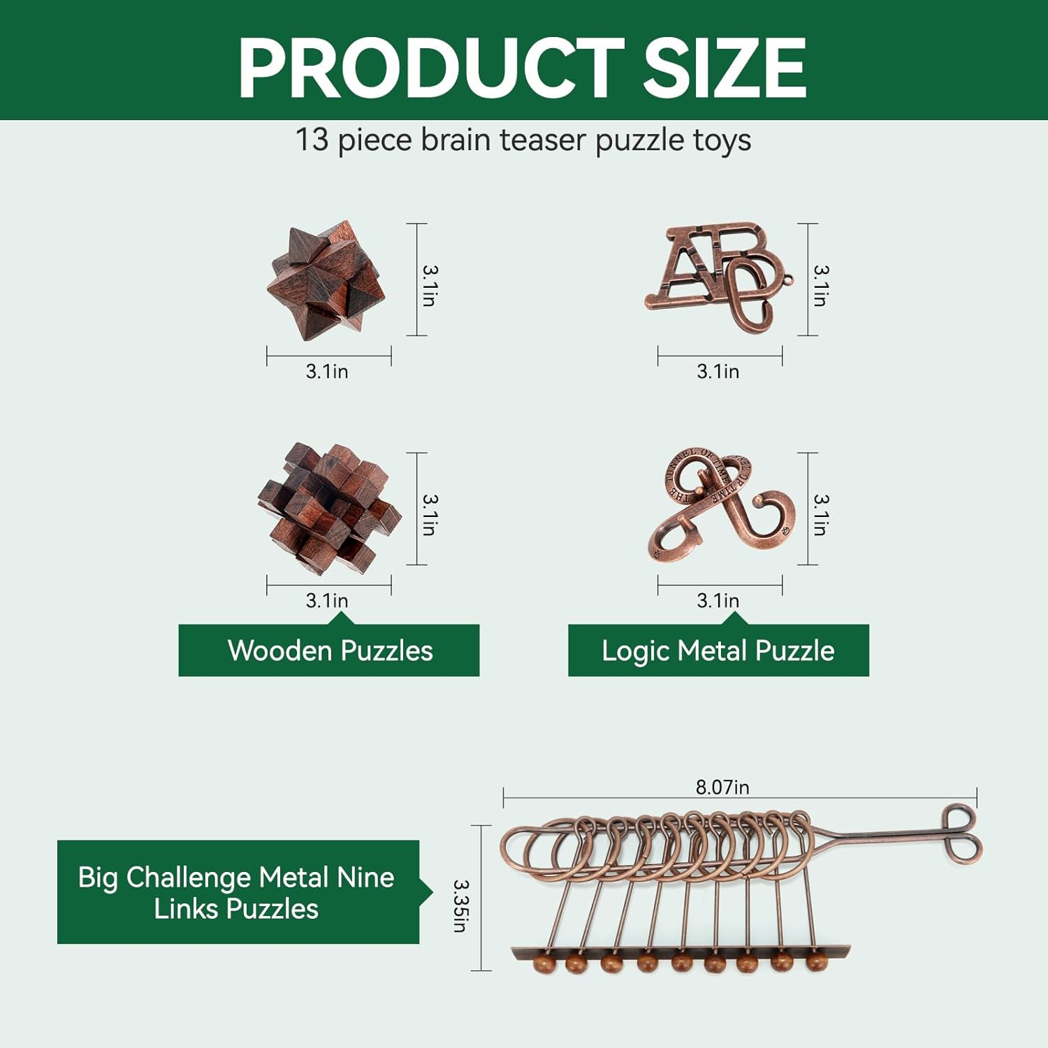 13 Pcs Brain Teaser Puzzles for Adults Teens - Metal Puzzles 3D Puzzle Game Toys for Adults Teens - Wooden Unlock Interlocking Puzzle Adult IQ Education Smart Toys