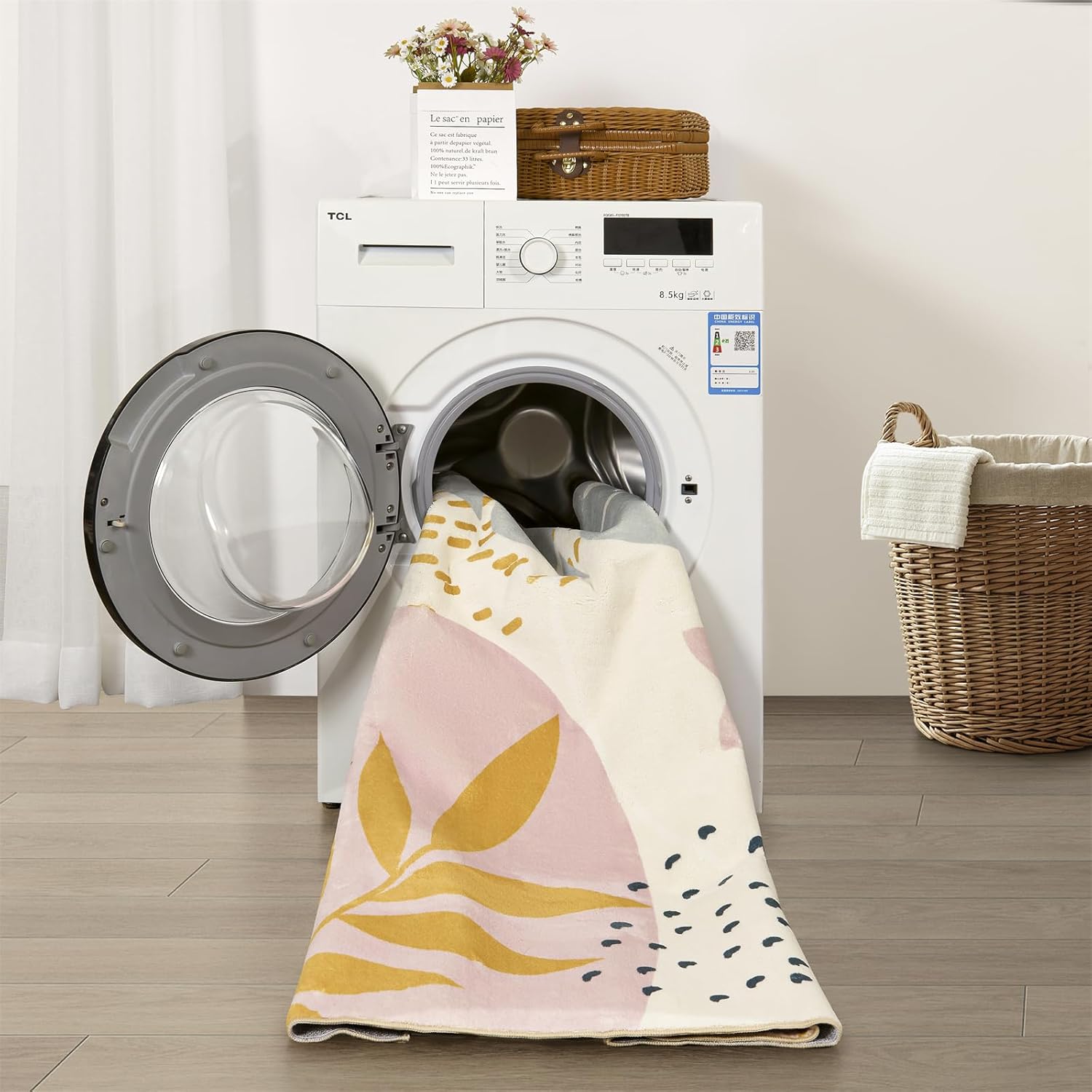 RoomTalks Cute Pink Nuresry Rug Washable, Boho Modern Contemporary Aesthetic 5x7 Area Rugs for Bedroom Dining Living Room Dorm, Abstract Art Tropical Leaves Thin Indoor Entryway Rug Carpet