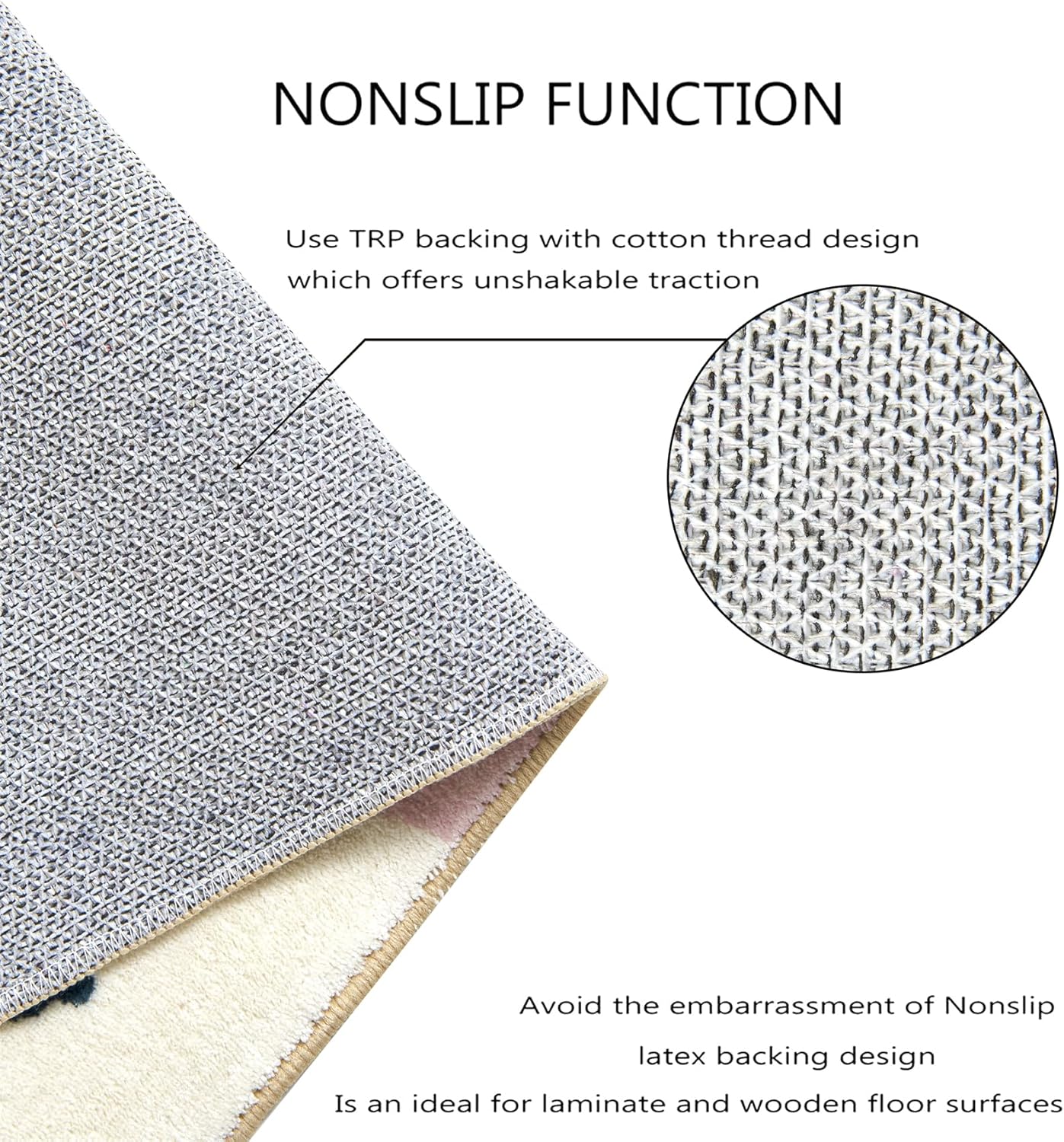 - [NON SLIP TPR BACKING] -- The non-slip TPR backing prevents slipping, tripping and holds the aesthetic accent rug more firmly in place. This pink nursery rug used upgraded material makes mat odor-free and protect your floors from moisture and scratches