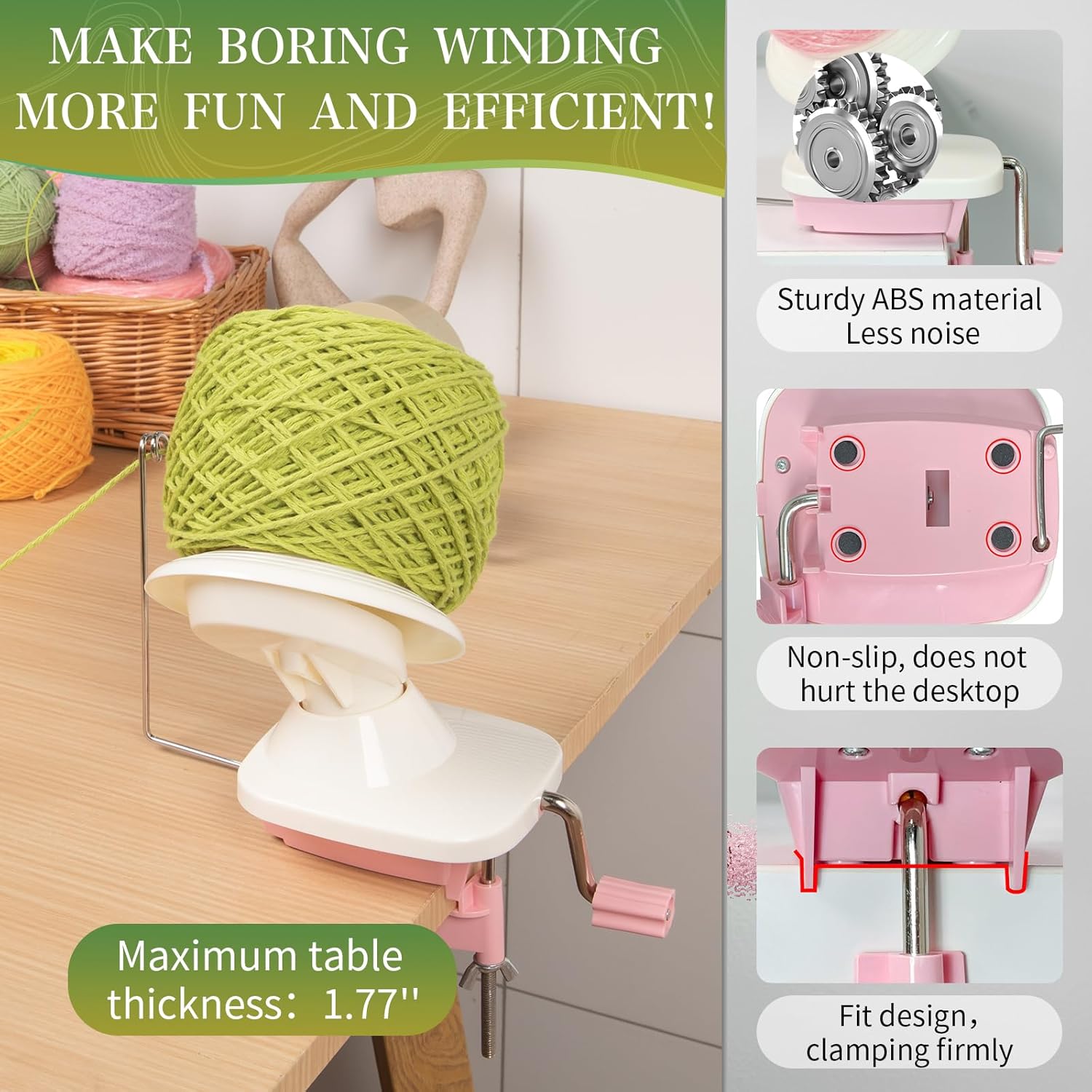- 【Perfect Fit, No Damage to Desktop】The crochet yarn winder fit perfectly with the desktop and stay firmly inplace without wobbling around. But you have make sure your table has a squareedge. The silicone on the bottom and bolts is non-slip and prevents you from hurting your desktop. NOTE: For tables less than 1.77'' thick