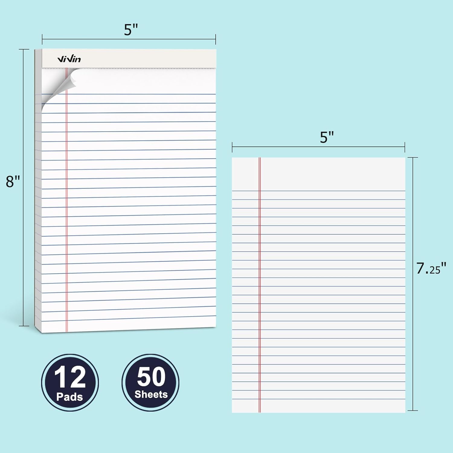ViVin 5 x 8 Inch Legal Pads, 12 Pack, Narrow Ruled, 50 Sheets Per Writing Pad, Perforated Note Pads Ideal for Home, Office, Business, 600 Sheets, White Paper