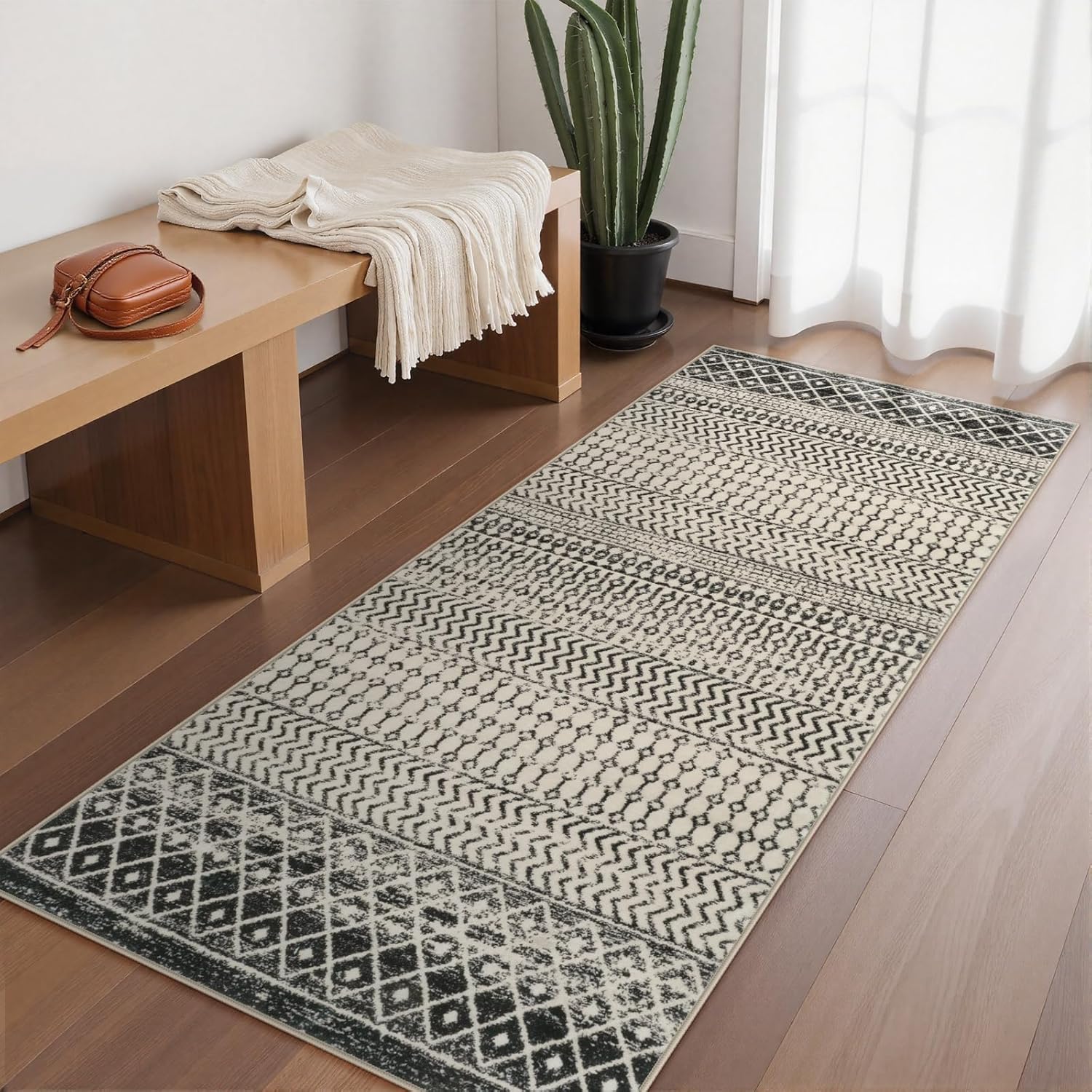 Moroccan Rug Runners for Hallways, 2x5 Ultra Soft Non-Slip Washable Rugs for Bedroom, Low Pile Distressed Black Rug Carpet Runner for Entryway Kitchen Bedroom Laundry Room