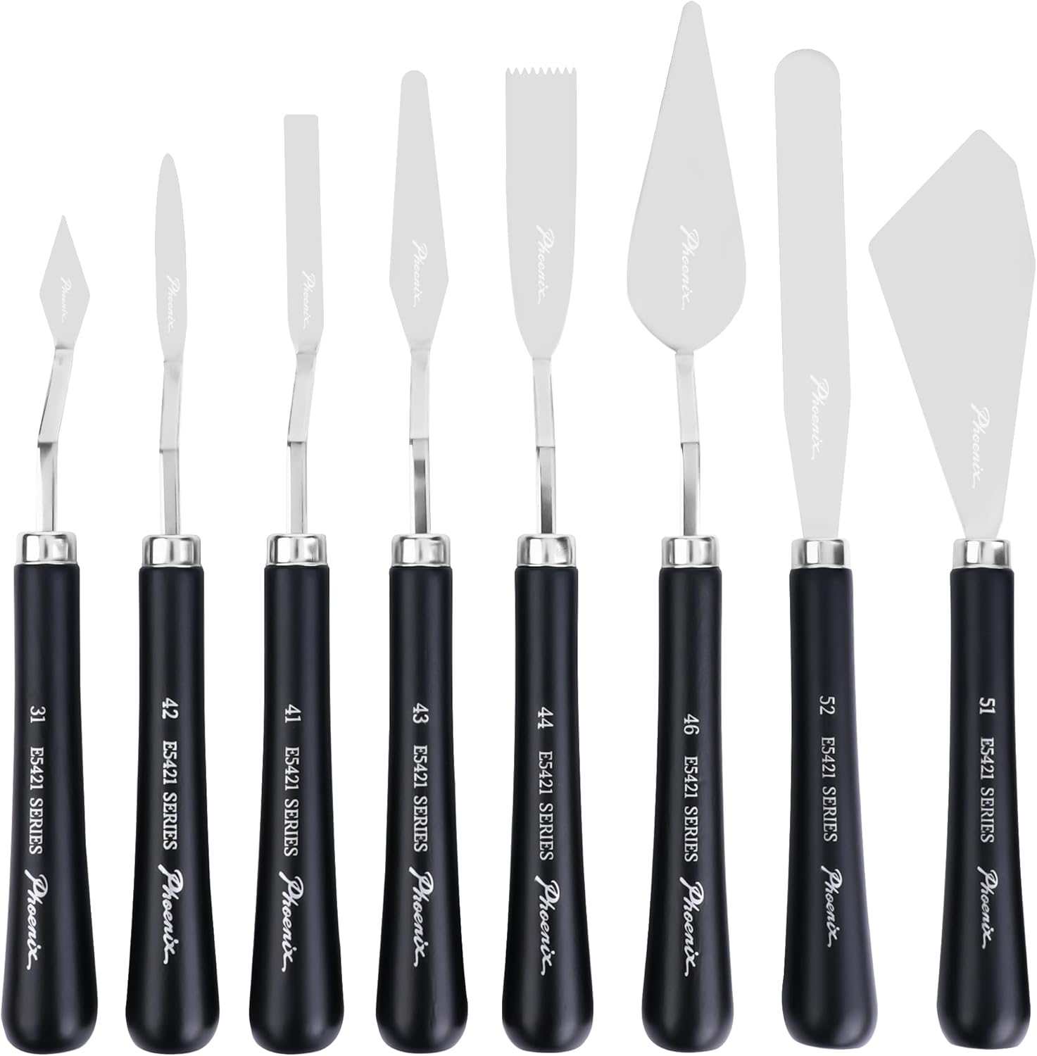 - PREMIUM STAINLESS STEEL BLADES - PHOENIX high-quality knives have been crafted with premium stainless blades that resist wear and corrosion from any media, including acrylics. Perfect for oil, acrylic, and oil pastels, these painting knives retain their sharpness over time, ensuring precise and even strokes on your canvas.
