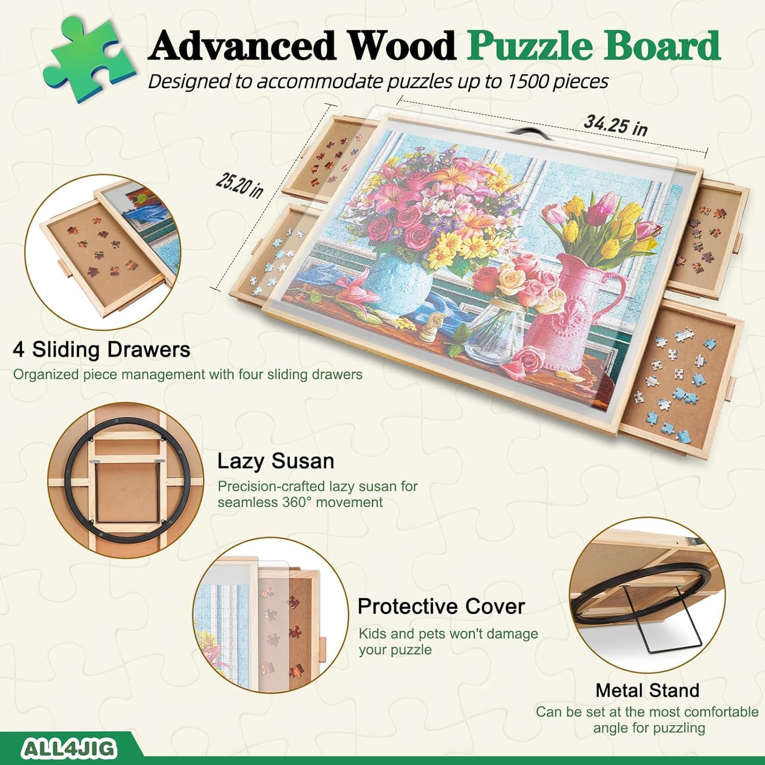 ALL4JIG 1500 Pieces 2-in-1 Tilting & Rotating Puzzle Board, 34.2" x 25.2"Adjustable Angle Puzzle Board with 4 Drawers & Clear Protective Cover, Birthday Gift for mom