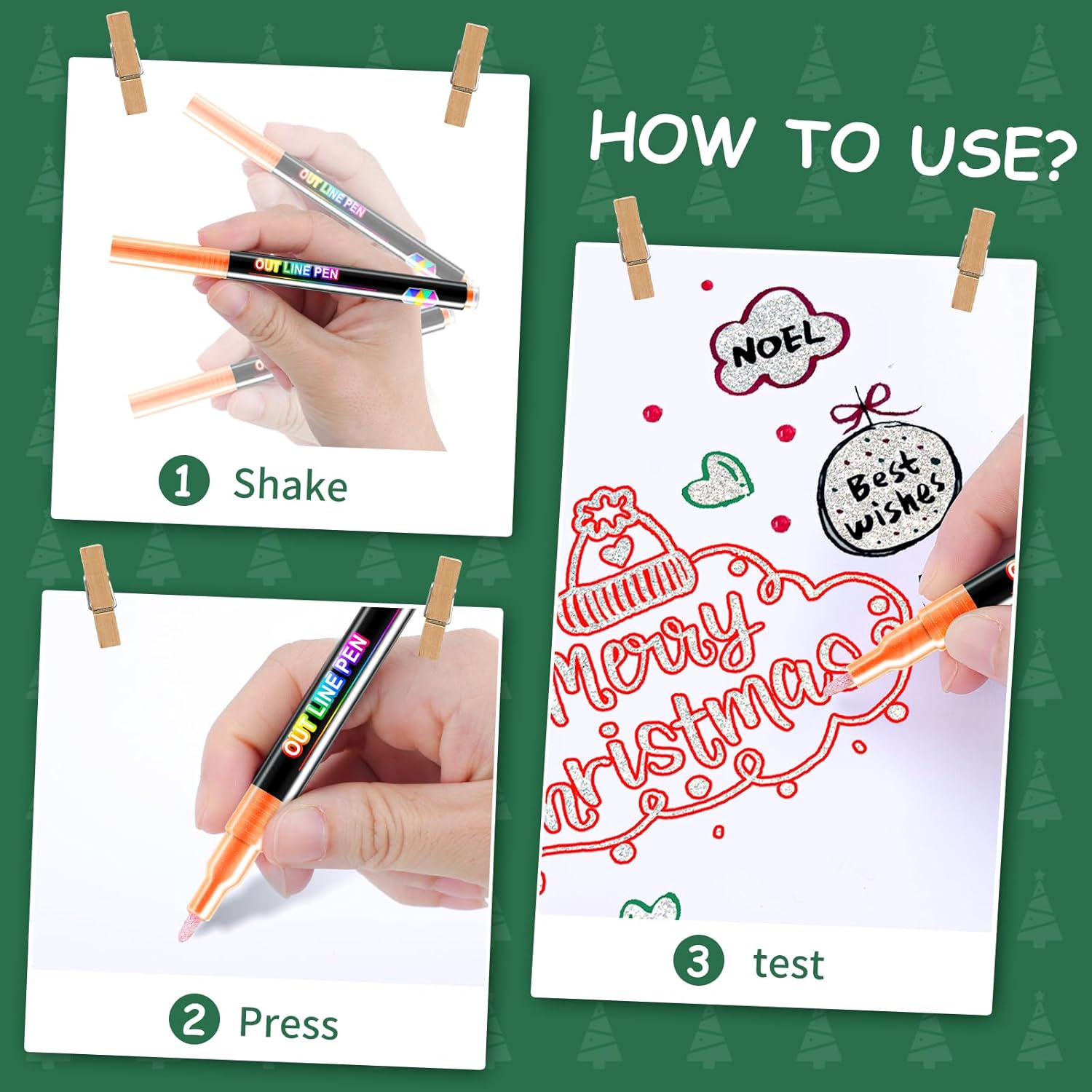 FUMILE 8 Colors Double Line Outline Markers,Glitter Marker for Kid Teens,Self Outline Metallic Markers for Art Supplies,Metallic Glitter Pen Set for Teen Girl.