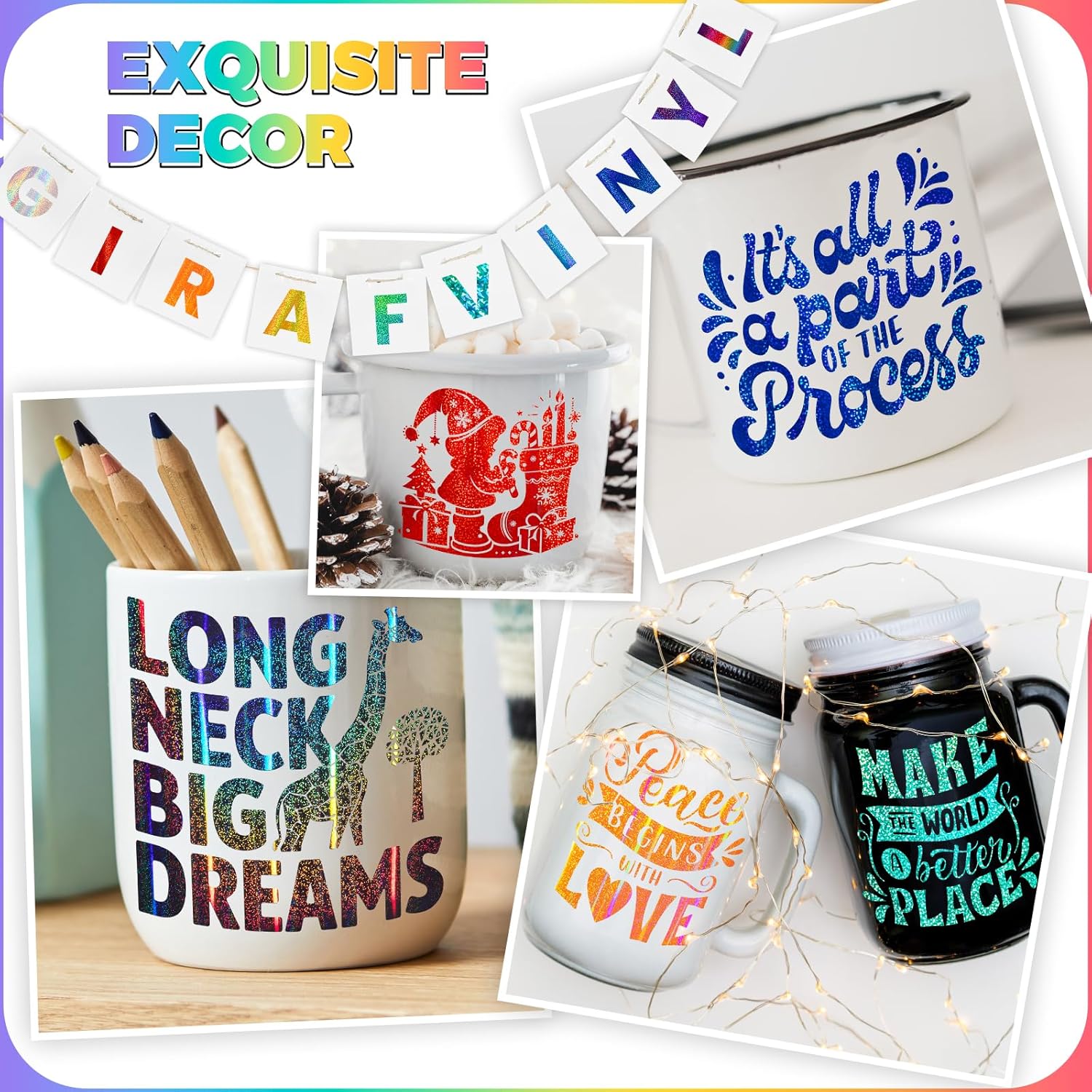 GIRAFVINYL Glitter Holographic Vinyl Bundle, Rainbow Holographic Permanent Vinyl 12" x 12" 17 Sheets Rainbow Glitter Vinyl Permanent for DIY Stickers, Signs, Cup, Home and Car Decorations