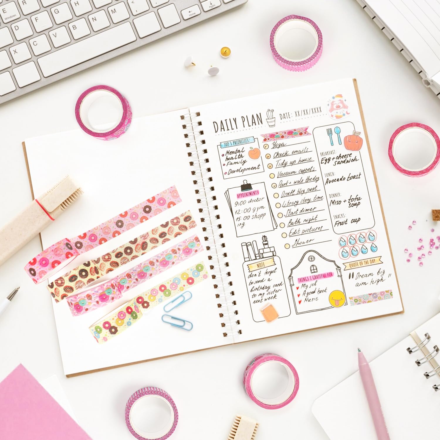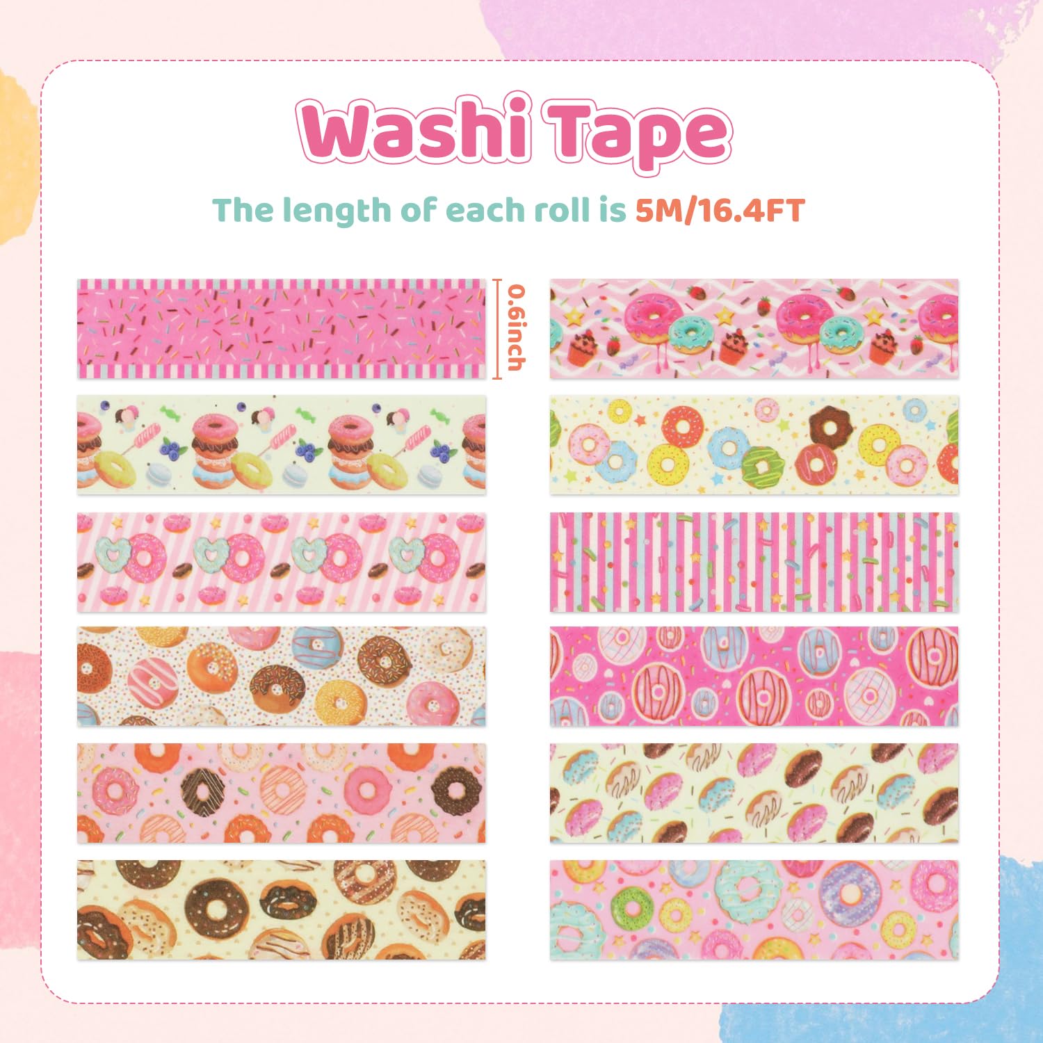 - VALUE PACKAGE: You will get 12 rolls colored donuts theme washi tapes with different styles. The colors are very fresh, charming and design are classic. Sufficient quantity can meet your various tapes needs, offering you a comfortable and ease using experience.