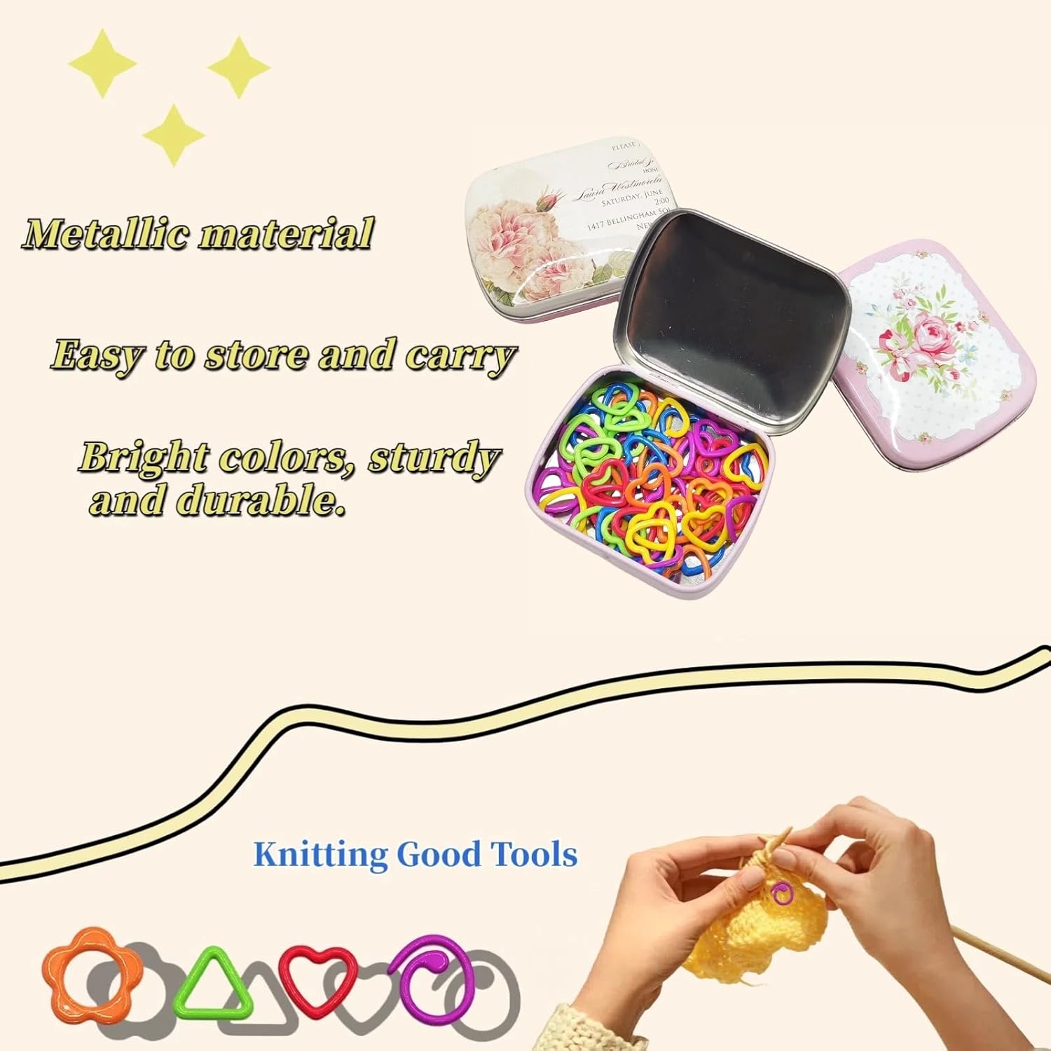 - Metal Stitch Markers: These metal stitch markers can be easily hung on knitting yarns.