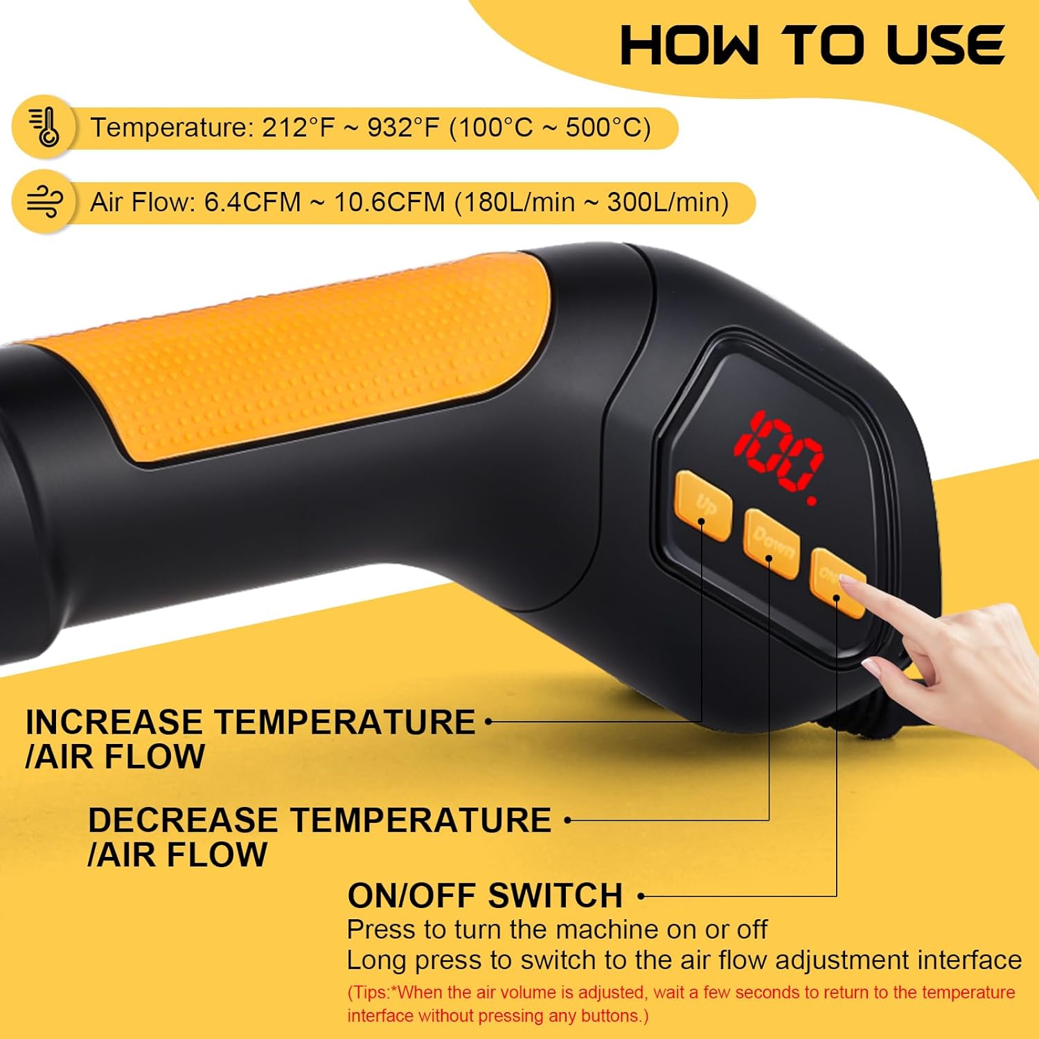 - Variable Temperature Control: This 700W low-noise heat gun has 10 temperature gears, adjustable from 212°F to 932°F (100°C to 500°C), and the air flow is 6.4CFM~10.6CFM (180L/min~300L/min). You can choose the appropriate gear according to your needs.