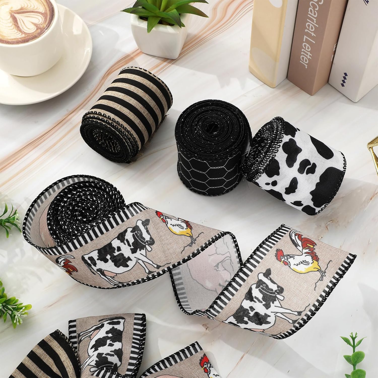 Farmhouse Animal Wired Edge Ribbons Cow Chick Pig Stripe Chicken Wire Decorative Fabric Wrapping Ribbons for DIY Crafts Wreath Bow Making Supplies, 4 Rolls, 24 Yard