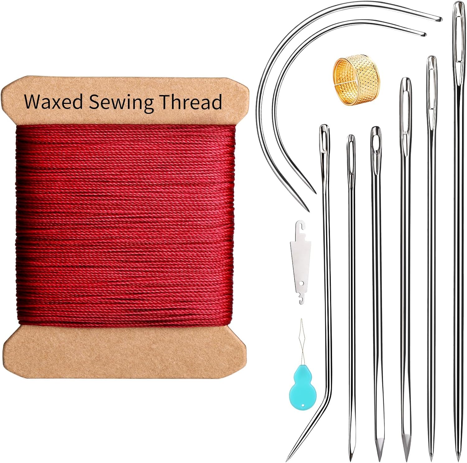 Repair Sewing Kit, Upholstery Needle with 32 Yard Waxed Thread and 8 Pcs Heavy Duty Leather Needles for Hand Stitching, Canvas & Quilting - 0.55mm Round Waxed Thread Dark Red