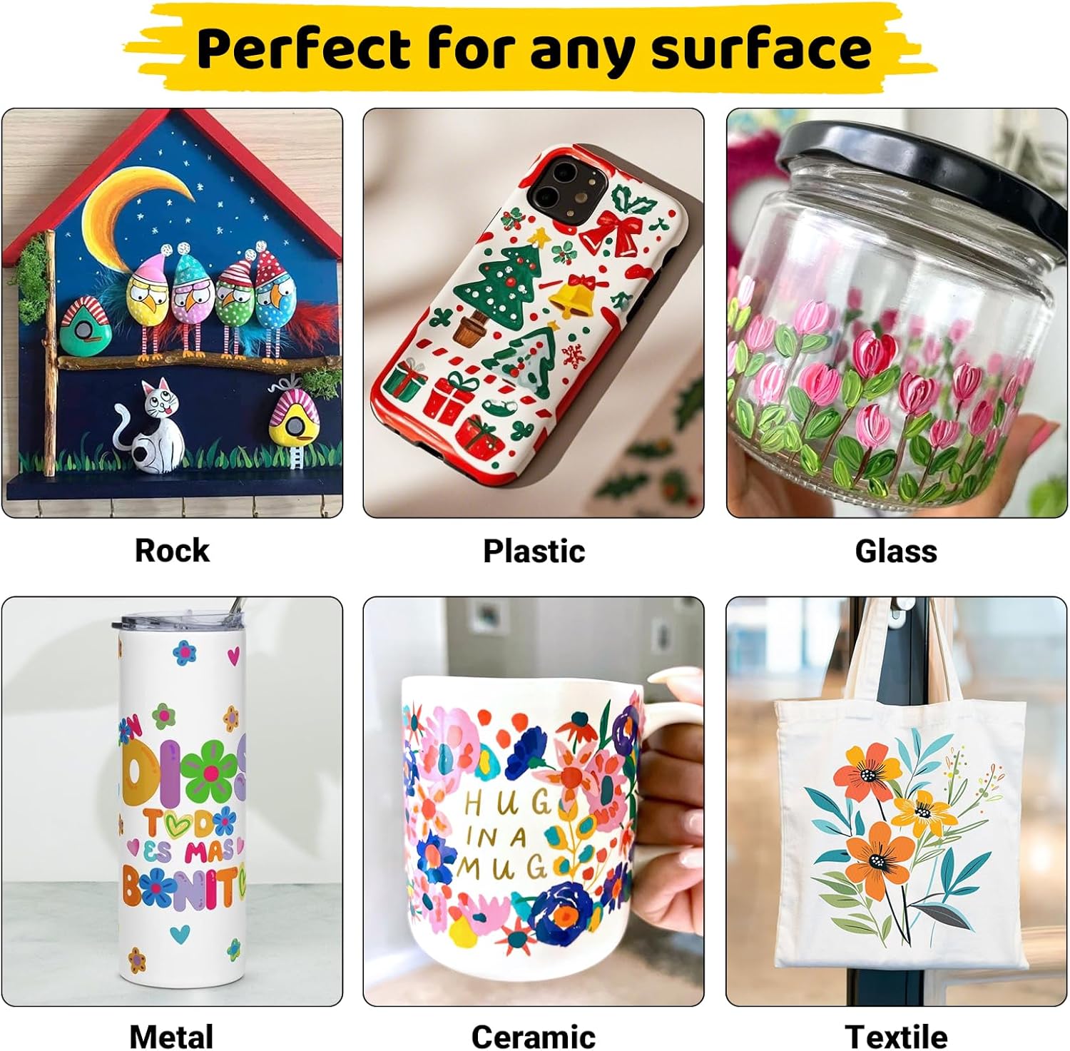 - Suitable for mulit surfaces - Acrylic paint pens are suitable for most surfaces such as fabric, petroglyphs, glass, wood, metal, plastic and even pumpkins, leaving a permanent mark. So it is great for painting, doodling, crafting, holiday decorations and other activities. Premium coloring markers for adults and kids.