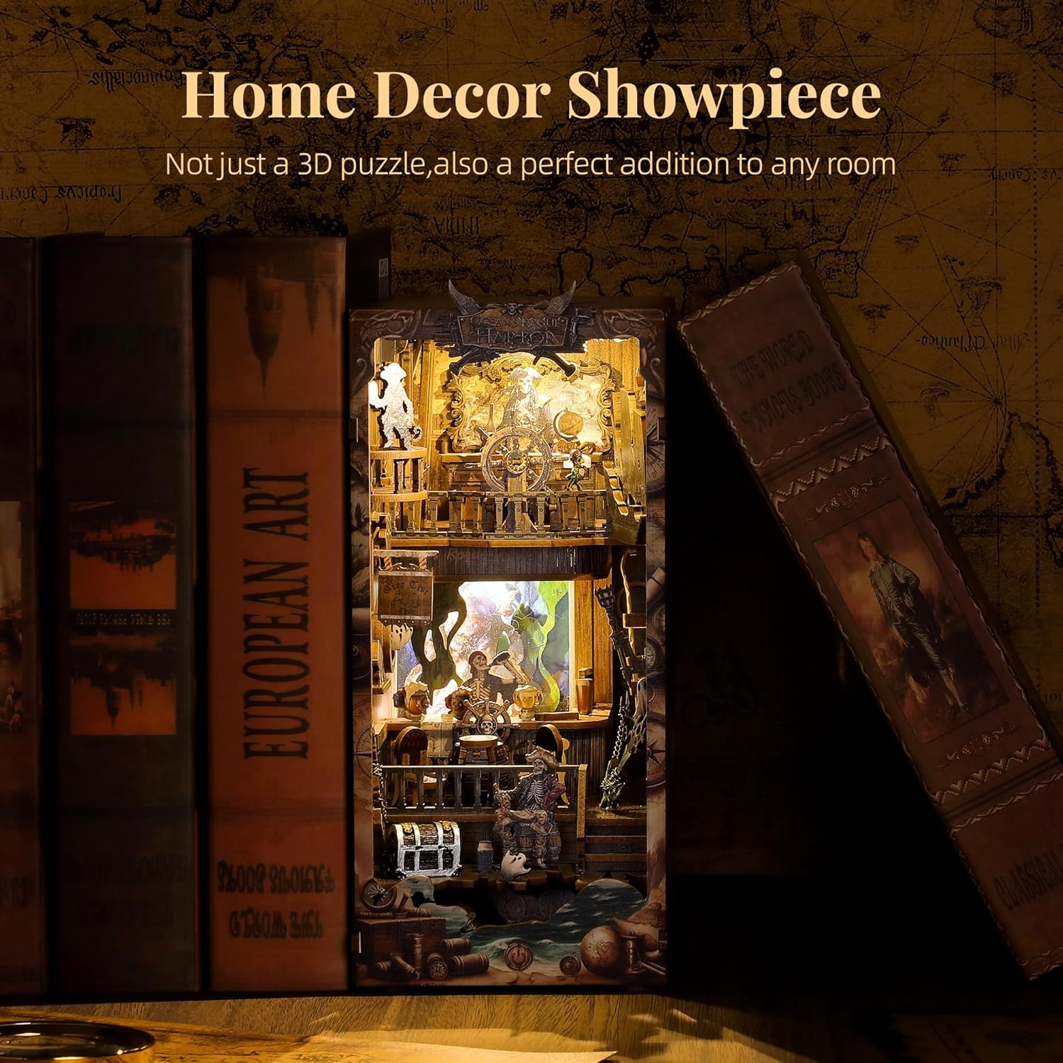 - 【Embark on a Pirate Adventure with a Stunning Miniature】Immerse yourself in the world of pirates with this 3D wooden puzzle book nook. Designed with intricate details, it features a pirate ship's treasure-filled cabin, complete with a pirate captain, mysterious ghosts, and hidden treasures. It's the perfect way to bring the sea world into your living space!