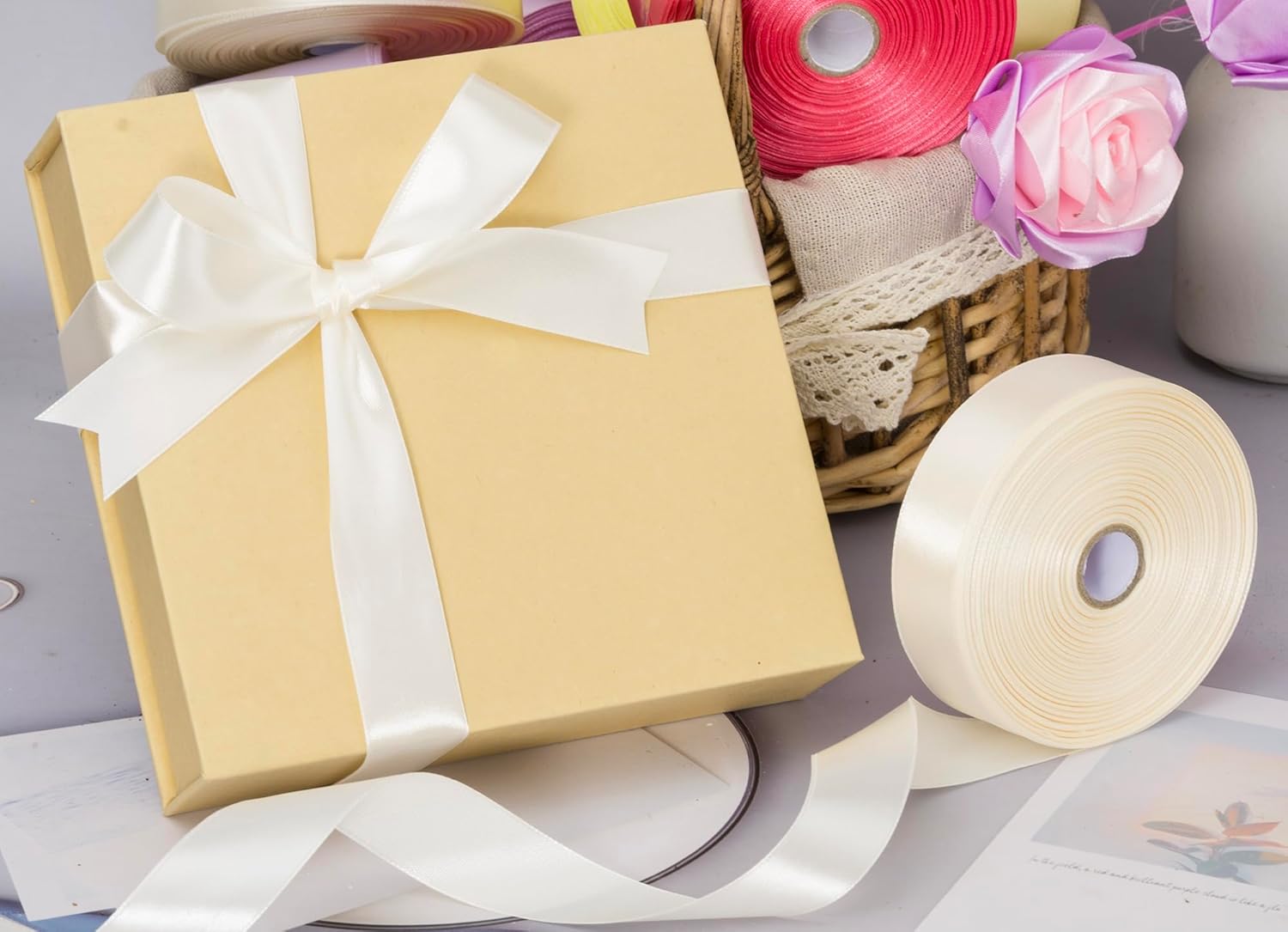 - Bright Color ribbons, great color fastness; Bright and lively, this ivory ribbon adds a lively atmosphere to gift wrapping or holiday decorations