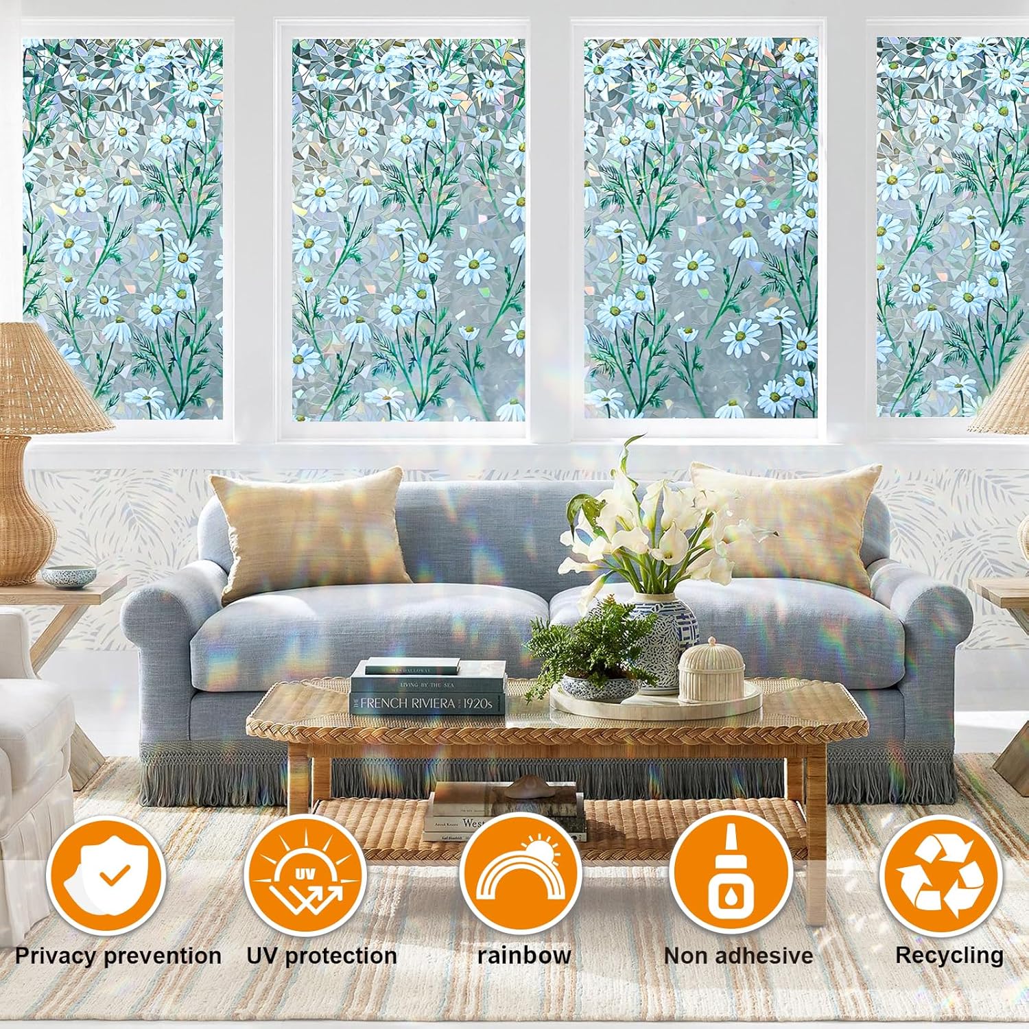 Window Privacy Film Stain Glass Window Film Rainbow Window Film Window clings Non-Adhesive Reusable Decorative for Room (Daisy Rainbow, 35.4 x 157.4 in)