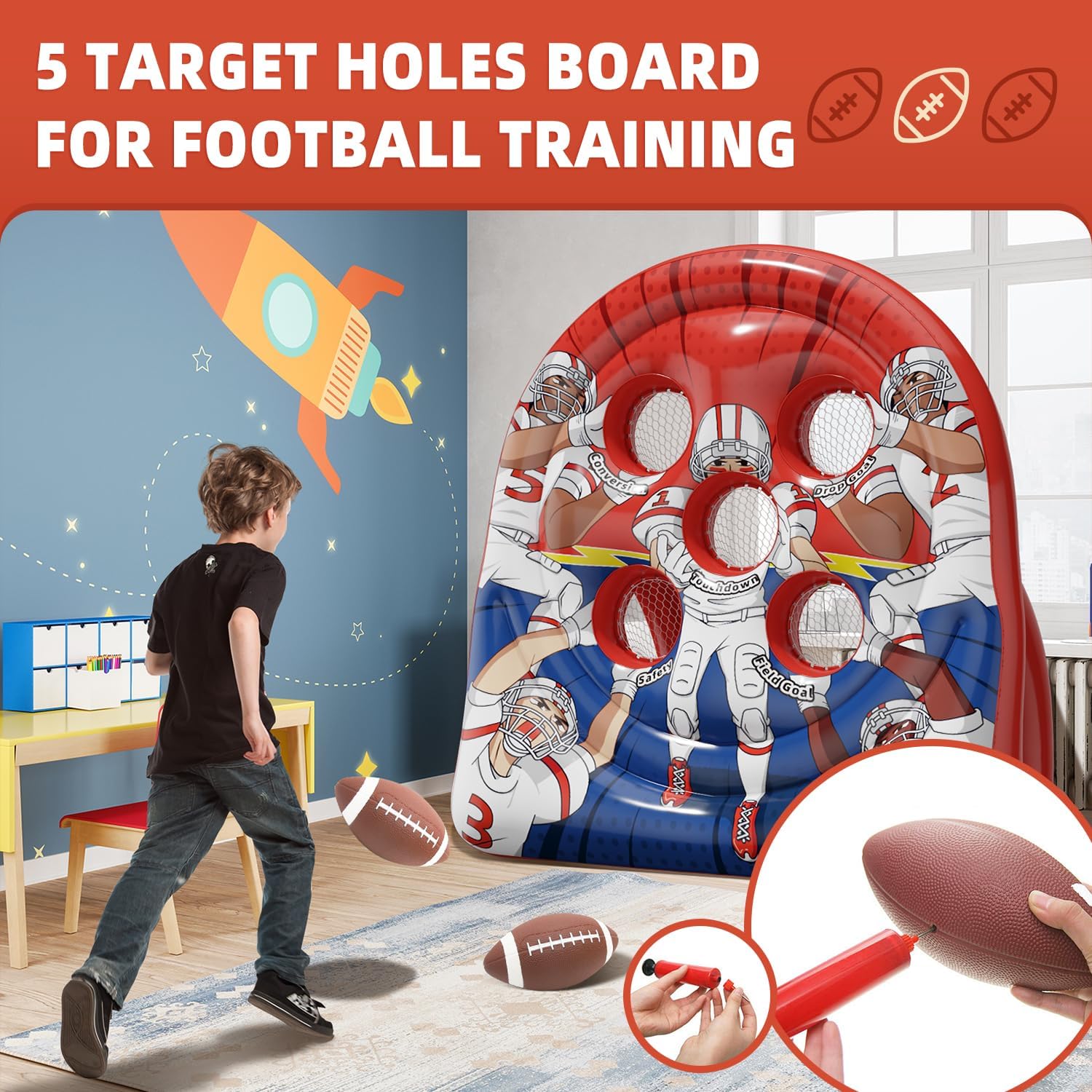 - Football Toys for Kids 6-18: The inflatable toss game inflates over 6ft tall. Withing the electric air pump, you can inflate the football throwing target within 10 mins. You do not need to waste time at your yard football game with the fast of the valves system.