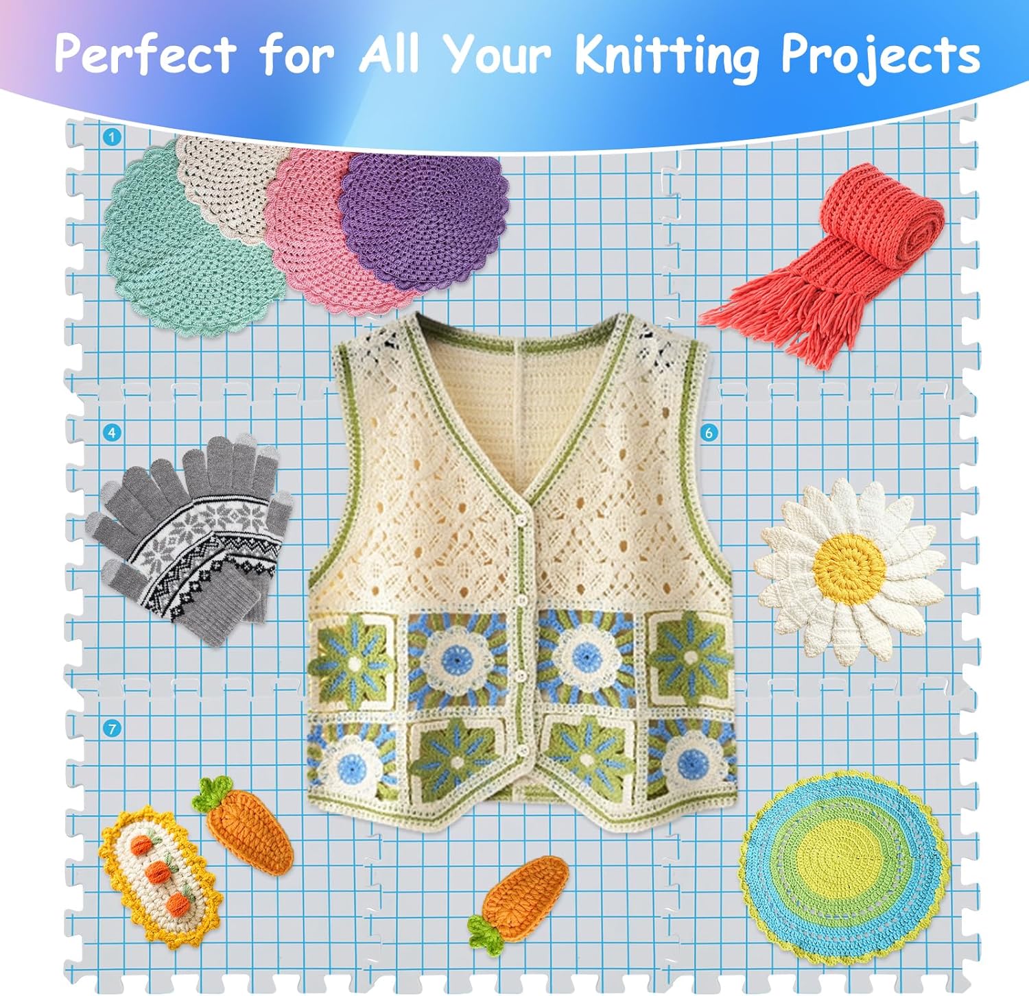 - š§¶[Universal for All Projects] - The size of individual knit blocking mats is 12*12 inch, you can assemble them into any shape as your crochet projects need. 1 inch grids are perfectly aligned as preference that allows you to precisely work on your projects and professionally finish them without any doubt.