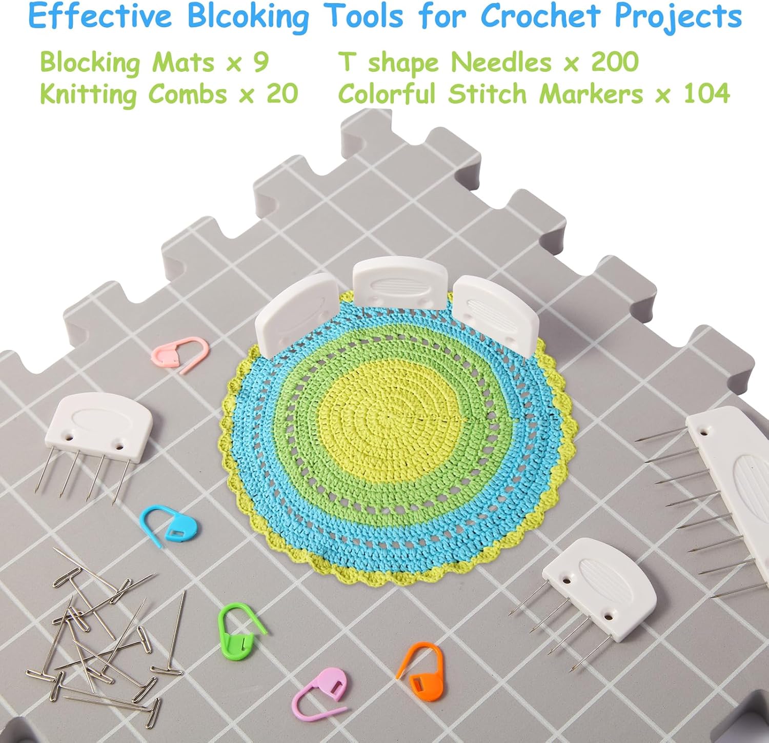 - š§¶[Easy Installation] - Each piece of interlocking blocking boards is marked with a number, just follow the number arrangement can be easily assembled. You can assemble those knitting blocking mats into different shape for different projects. Those T-pins and stitch markers will offer extra assistance for your handwork.