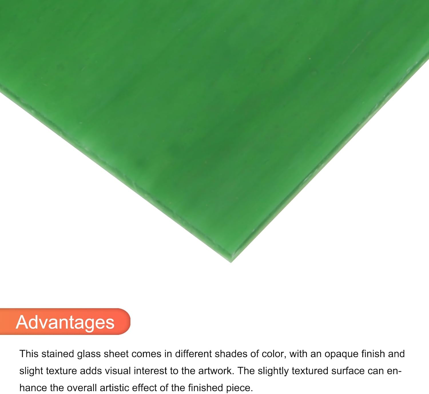 - This stained glass sheet comes in different shades of color, with an opaque finish and slight texture adds visual interest to the artwork. The slightly textured surface can enhance the overall artistic effect of the finished piece.
