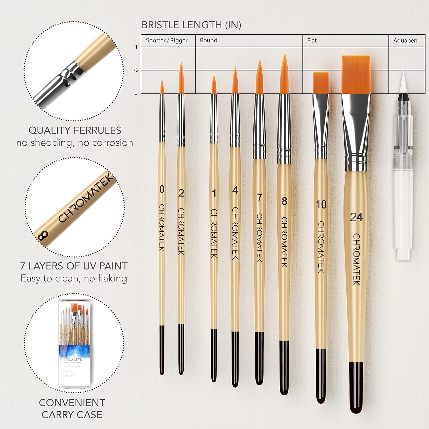 - 8 SYNTHETIC SQUIRREL BRUSHES AND AQUA PEN: Includes 8 professional-grade synthetic brushes that hold water exceptionally well while maintaining a fine point. These brushes are durable, featuring double-crimped ferrules and anti-peel coating. The aqua blending pen is perfect for painting on the go, whether for washes or creating unique effects. This combination is ideal for both beginners and seasoned professionals.