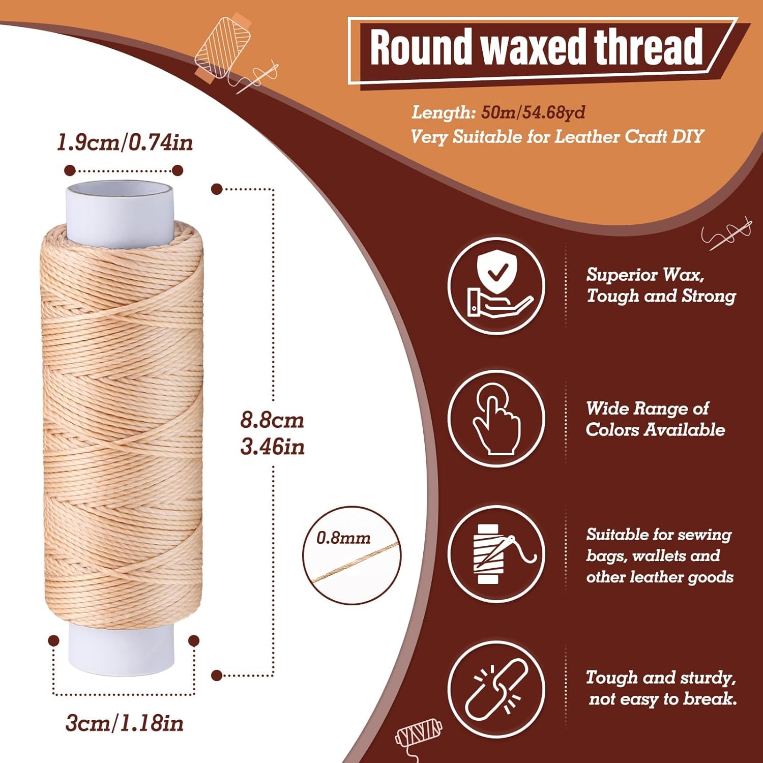 - Waxed Thread for Leather: 0.8 mm thick, 54 yards per spool, leather sewing thread made from braided polyester, the amount of wax on the cord is moderate and easy to handle, Multi-strand woven round waxed thread strong, wear-resistant, and waterproof, ideal for leather sewing, stitching, braiding, knotting, beading, binding, necklace and bracelet making