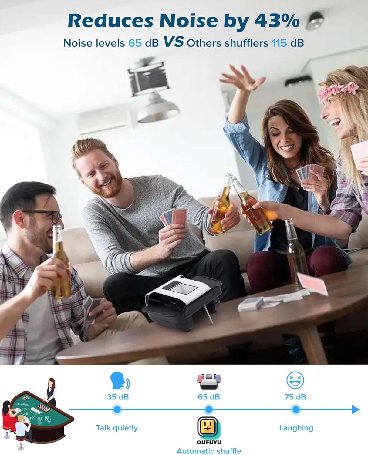 - LOW-NOISE SHUFFLING : This automatic shuffler for cards runs quieter than other shufflers, ensuring a distraction-free gaming environment. Unlike other noisy shufflers, this shuffler allows you to focus on the game without being disturbed by loud shuffling noises