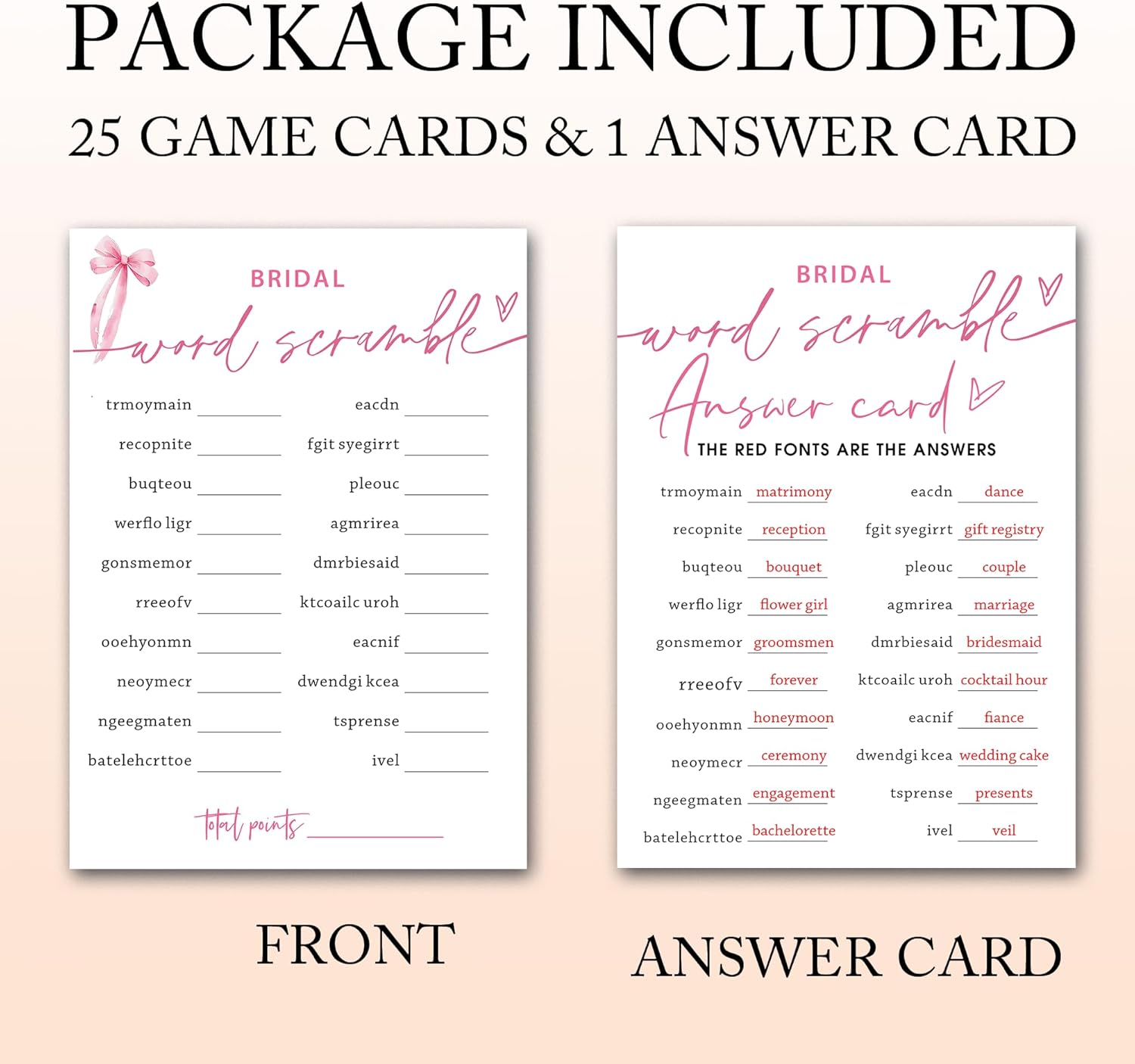 Bridal Shower Games Cards, Bridal Word Scramble, 25 Cards with 1 Answer Card, Engagement Party Games for Guests, Pink Ribbon Bow Wedding Party Supplies - E14