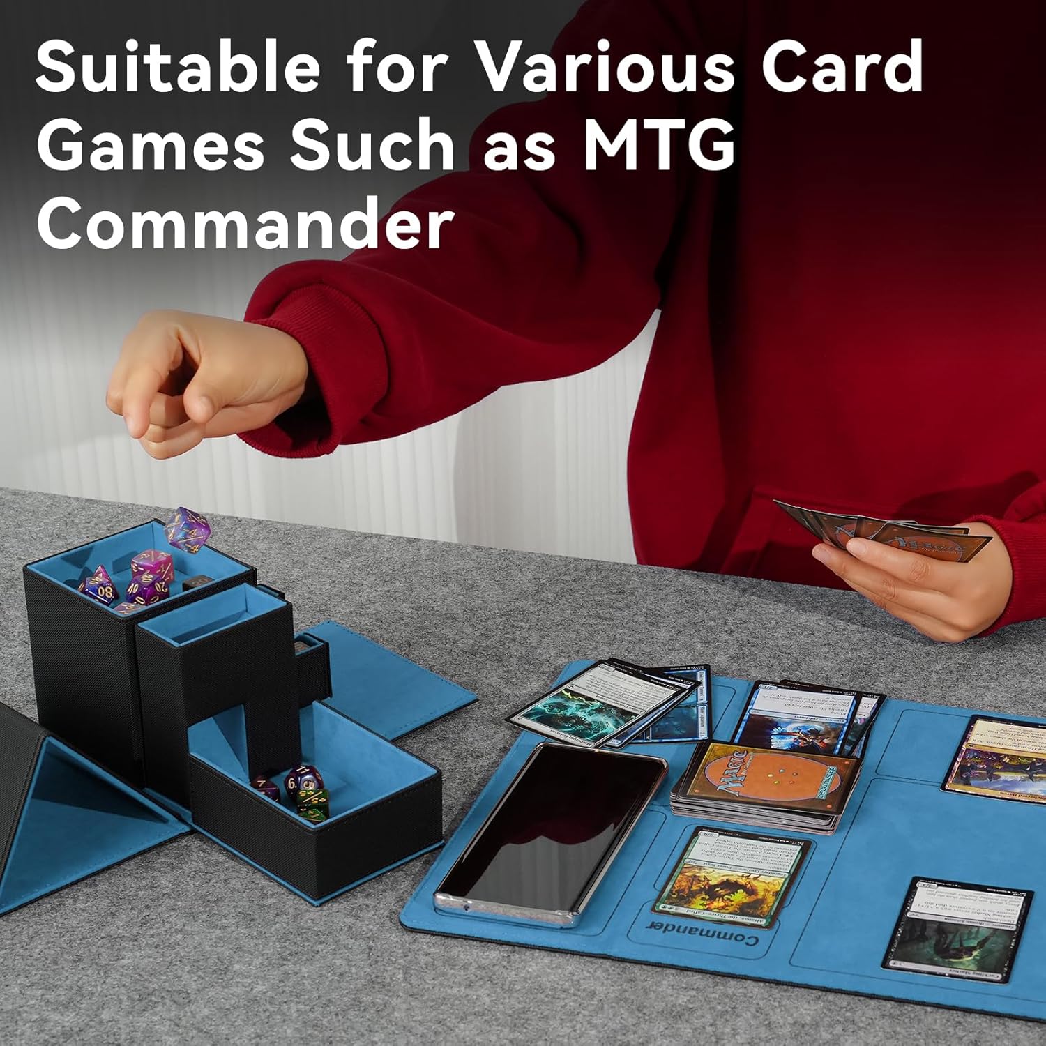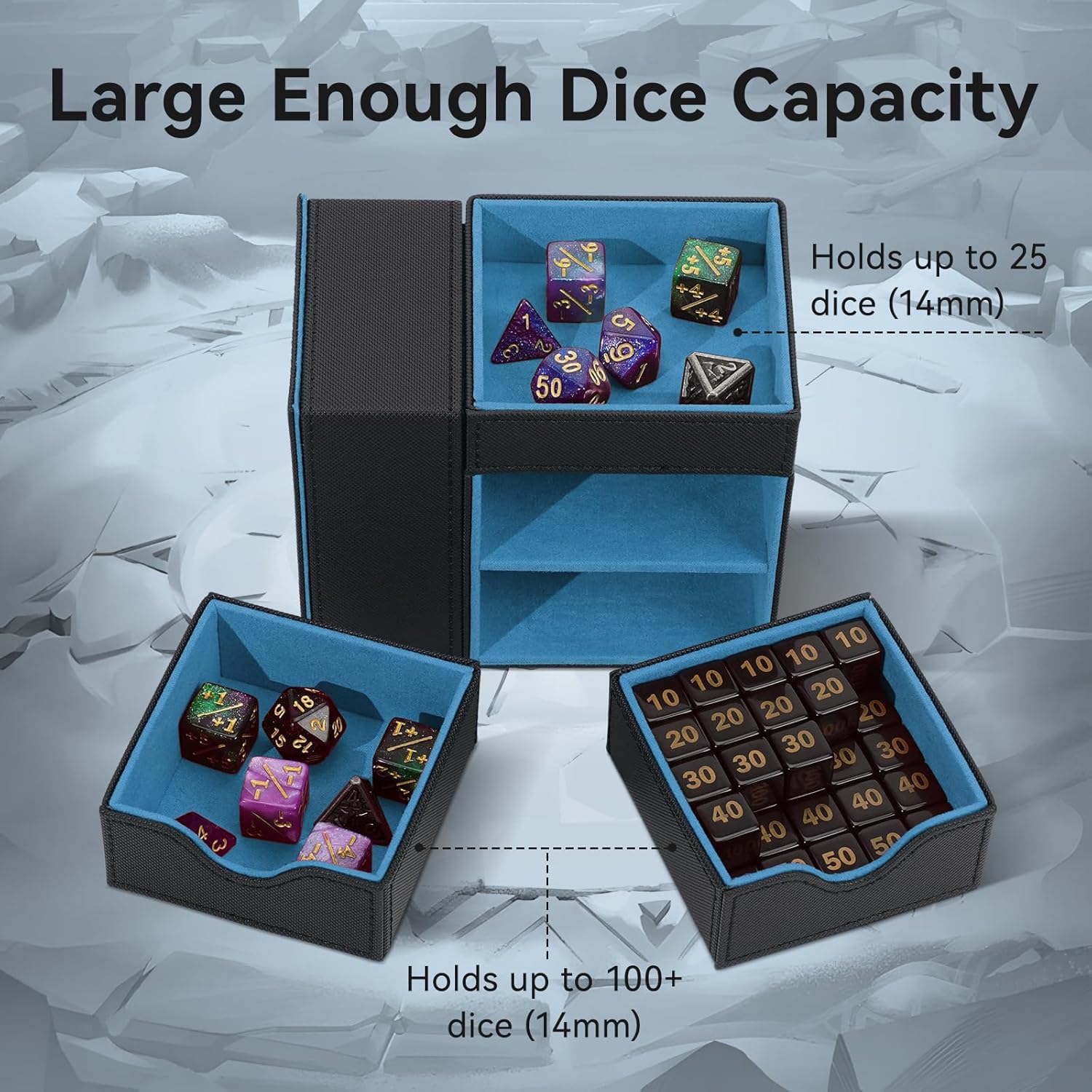 Dice Tray & Dice Tower Storage Box, 3 in 1 Dice Holder Case (Dice Rolling Tray, Dice Rolling Tower, Dice Storage Drawers), Leather Magnetic Closure DND Accessories Gifts for RPG MTG, Black/Blue
