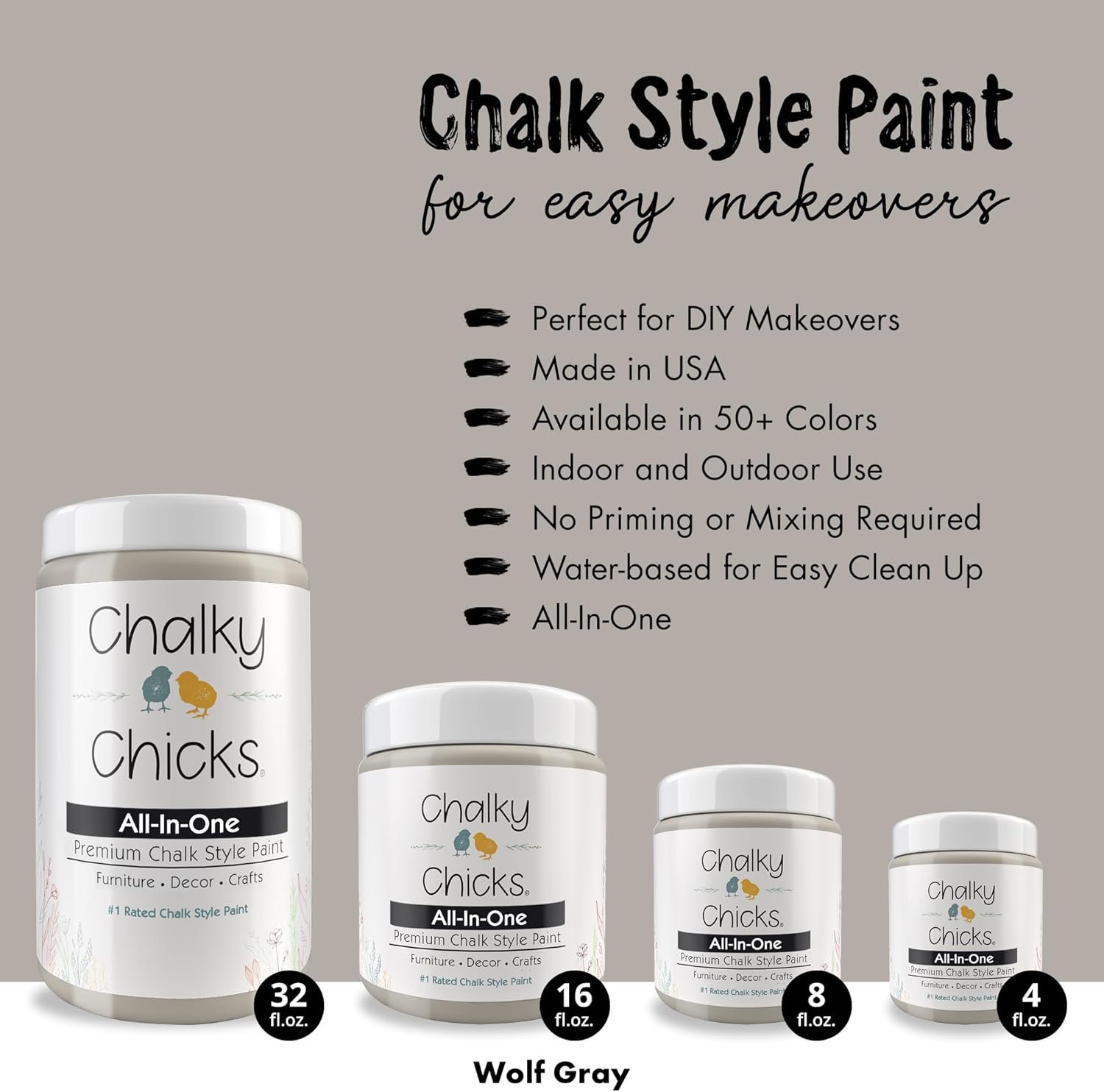 Chalky Chicks All-in-One Chalk Paint for Furniture or Cabinet - 8 Fl Oz - Matte Finish Wolf Gray (Gray/Beige) for Metal, Wood Furniture Paint - No Sanding All-in-One for Home Decor & Crafts, USA Made